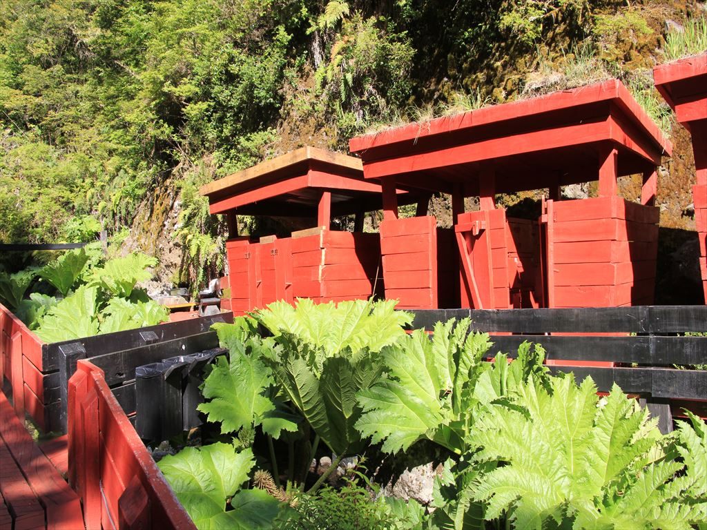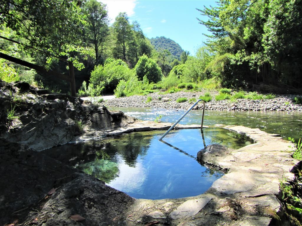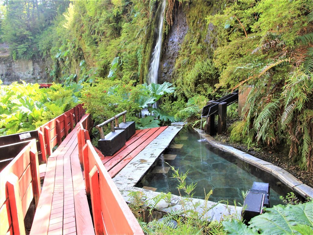 どれも和風の岩風呂で、座ると胸の高さあたりまで浸かることができます。周囲の木々の緑や花々の彩、空の青さと渓流などを眺めていると、今、チリにいるのを忘れてしまいそうです。なぜか奥飛騨の温泉郷を思い起こしました。