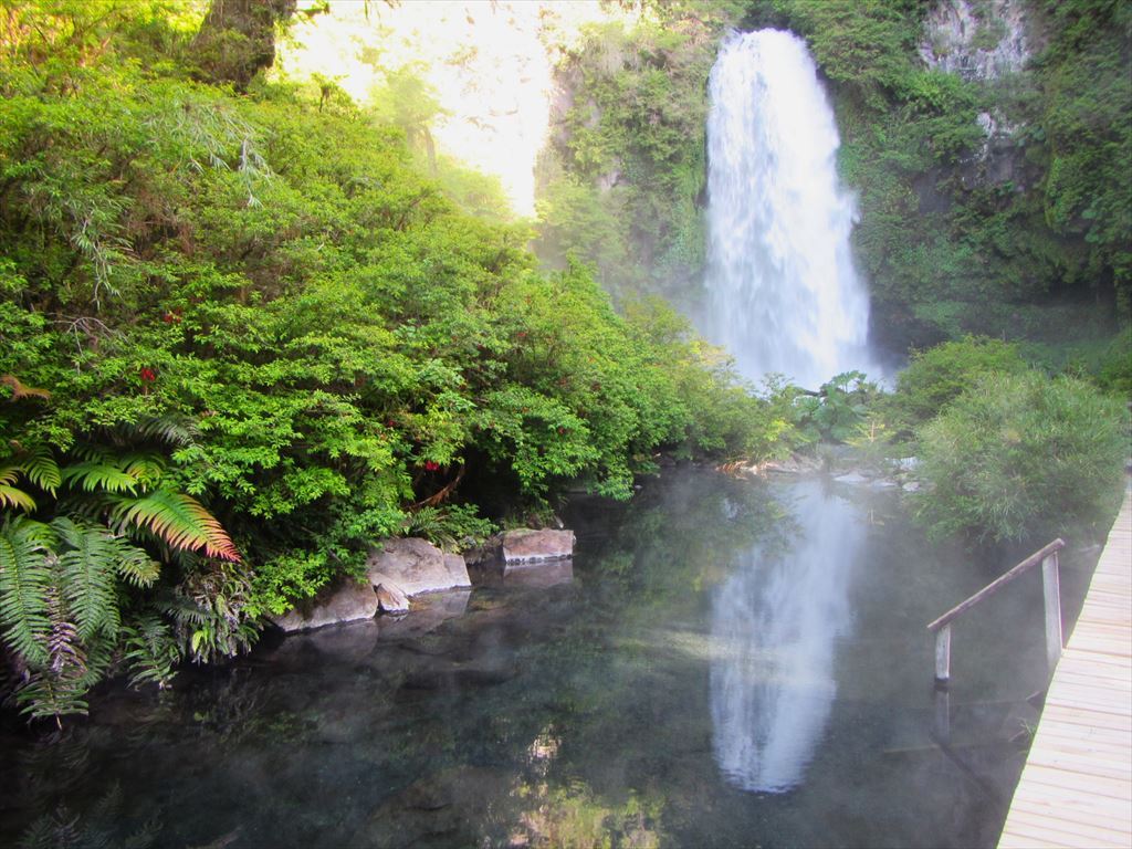 とにもかくにも、美しい光景が印象的で、カメラを構える手が休むことはありません。やがて一筋の直瀑の滝つぼで道は終わっていました。戻りがてら気に入った浴槽にいくつか浸かりました。見上げると人工物はまったくなく、深い緑と青い空だけが広がっています。週末はかなり混むようですが、地球の裏側でまったりと入浴できるすばらしい温泉です。