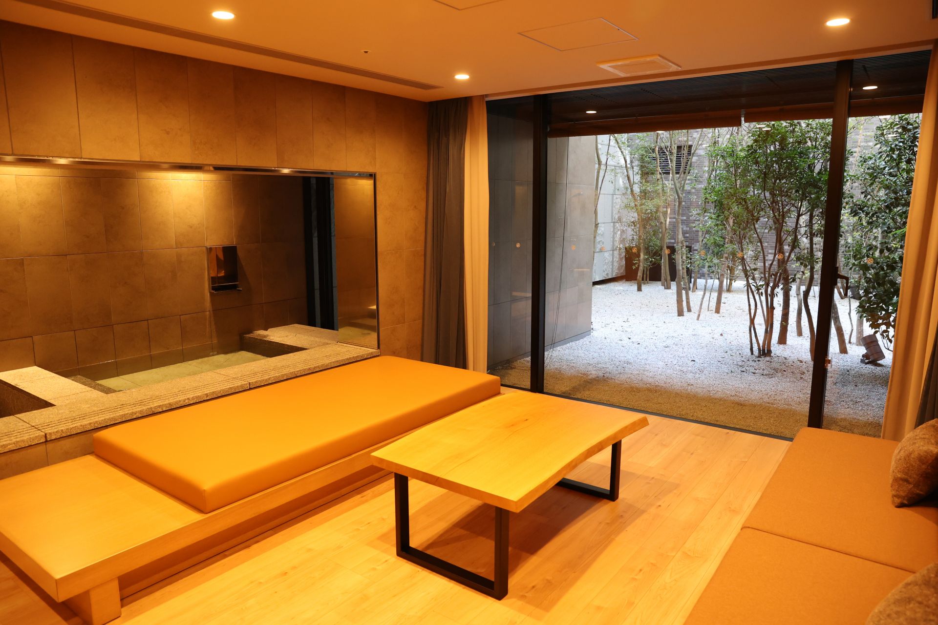 リビングエリアが広々したプライベートバスは、家族や友人とのんびりお風呂を楽しみながらテレビを見たり、ミニバー(飲み放題)のドリンクを飲んだり、お風呂以上の楽しみをもたらしてくれる空間です。持ち込みも可能で、貸し切り枠は2時間。中庭の借景もあり、雰囲気はとても開放的です。ホテルの最深部とも言えるこの究極のプライベート空間で、京都の「オク」を味わってみてはいかがでしょうか?