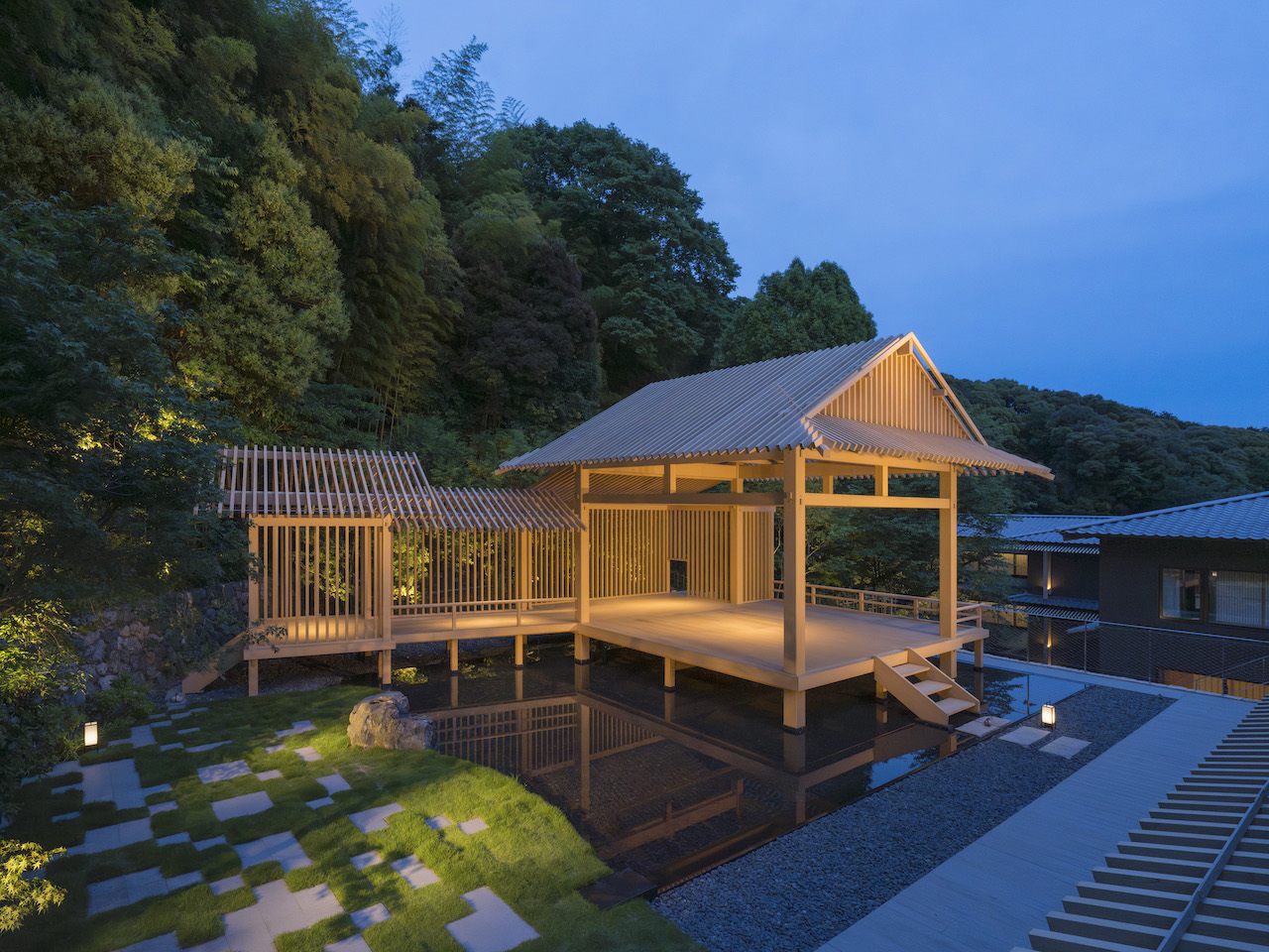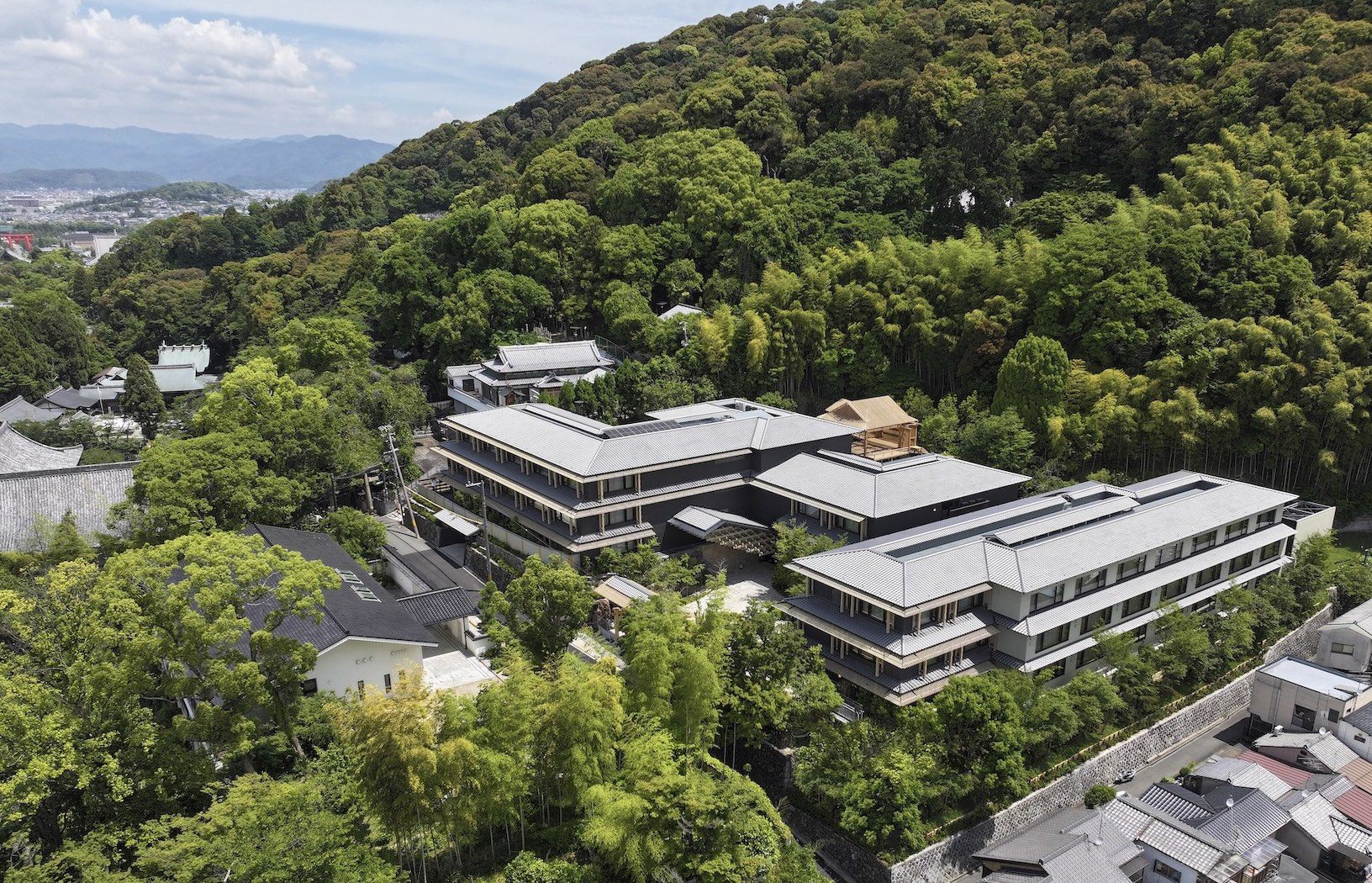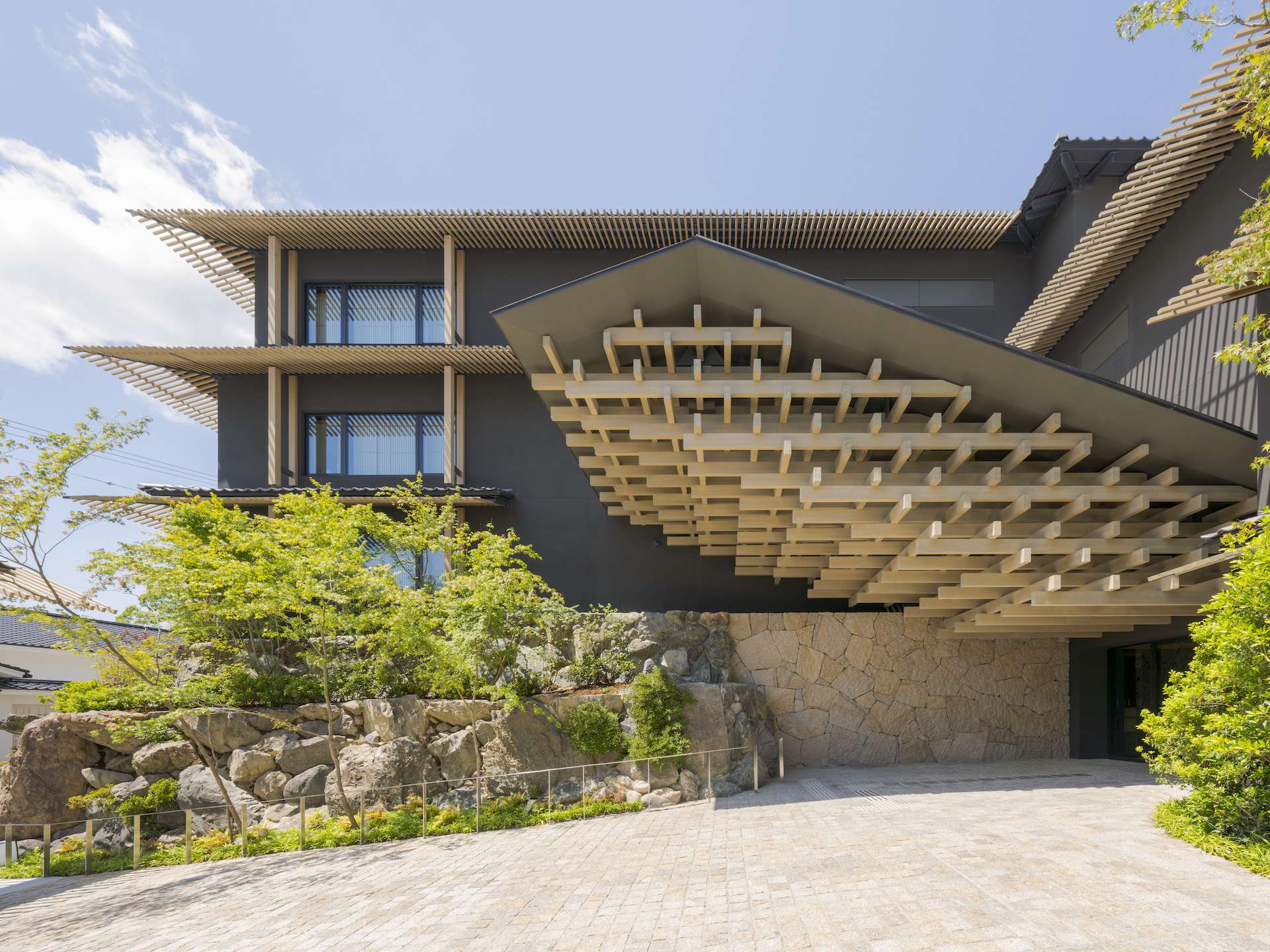 このサンクチュアリへの入口となる正門と、木の大庇をデザインしたのは世界的建築家の隈研吾氏です。マスターアーキテクトを務めた隈氏は、東山の自然豊かな環境と建物の調和を大切にし、森に対して開く配置計画を採用。それにより、ゲストは館内のどこにいても周囲の山々や美しい庭園を身近に感じることができる造りになっています。