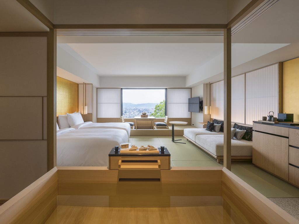 客室は世界的なインテリアデザイナーの橋本夕紀夫氏が、能の伝書『風姿花伝』の一節「秘すれば花」をコンセプトにデザイン。一番小さいサイズでも48平方メートルあり、部屋に入った瞬間、畳みのいぐさやバスタブのヒバの木の香りがゲストを迎えます。金のなぐり加工が施された壁は、見る角度や時間帯により印象が変化。部屋からの景色も京都市街や東山の森、能舞台など、向きによって大きく異なり、どれも趣があり魅力的です。