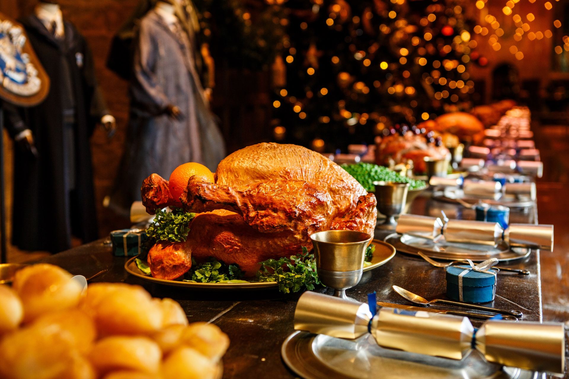 また、生徒たちが食事をする長いテーブルには、大きな七面鳥の丸焼きをはじめ、ハムや山盛りのグリーンピース、ローストポテトや焼きたてのパンなど、映画でも登場したご馳走が並びます。ハリーがホグワーツに入学してから初めて過ごした特別なクリスマスを、この「大広間」でぜひ体験してみてください。