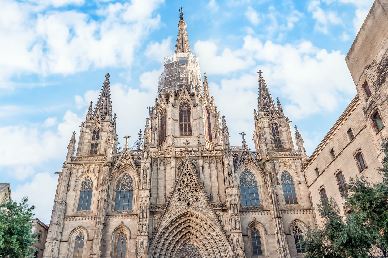 バルセロナのゴシック地区にそびえ立つカテドラル(サンタ・エウラリア大聖堂)は、完成まで約150年の歳月をかけて建てられた。その後も改築を繰り返し、現在の姿になったのは20世紀初頭。外観は精巧な装飾が施され、ゴシック様式の内部はステンドグラスなどが美しい。正面に中央祭壇があり、その地下にはバルセロナの守護聖女サンタ・エウラリアが眠る。聖堂内の高い天井とアーチが、ここが神聖な空間であることを改めて実感させる。
