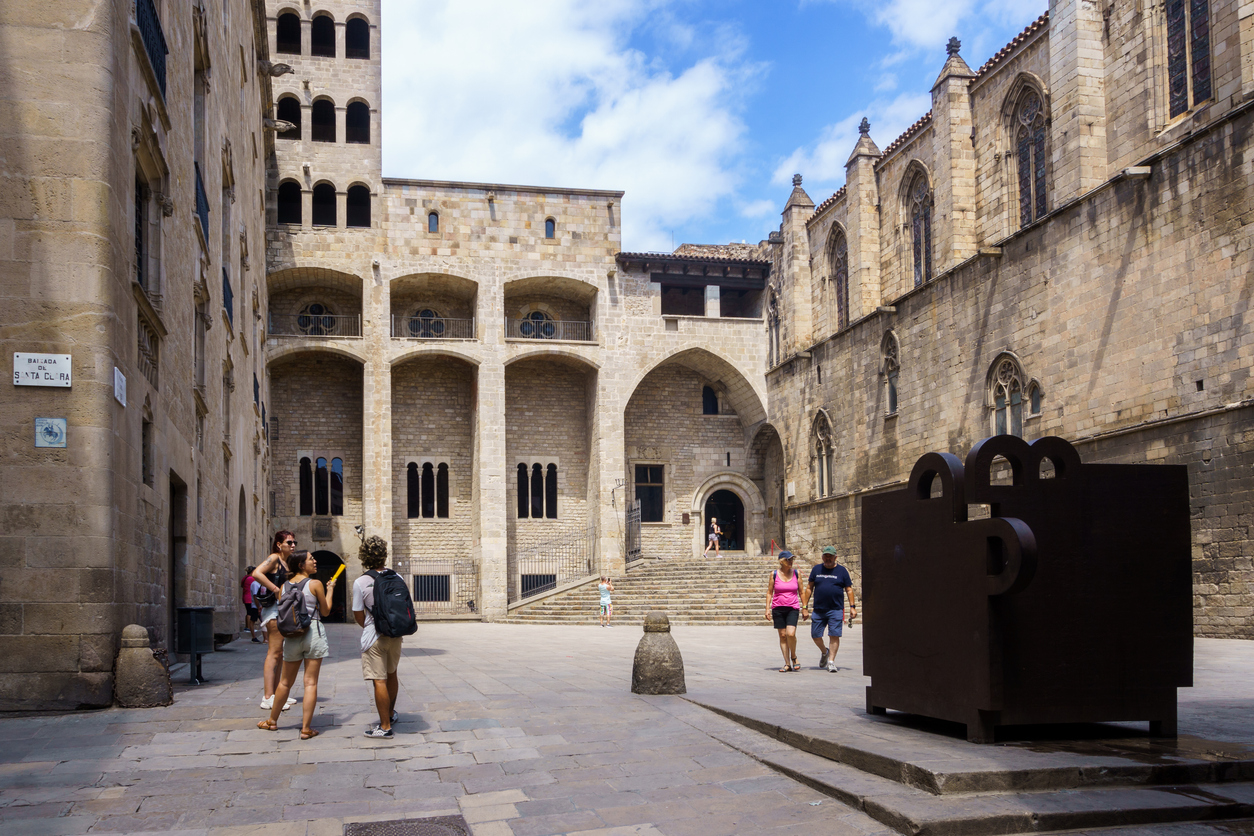 ゴシック地区の中心に位置する王の広場は、中世の雰囲気が漂う由緒ある広場。正面の旧王宮はバルセロナ伯爵の住まいとして使われており、広場にある四分円の階段はかつて航海から戻ったコロンブスがイサベル女王に謁見するために上ったものである。