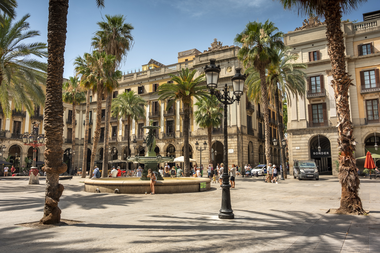 バルセロナの旧市街に位置するレイアール広場は、カフェやレストランが軒を連ねるにぎやかな場所だ。広場の中央には美しい噴水、その周りにはヤシの木がある。夜になると、広場はさらににぎわいを見せ、街灯が幻想的な雰囲気を作り出す。特に週末は、多くの地元の人々や観光客が集まり、バルセロナのエネルギッシュな夜を楽しむことができる。