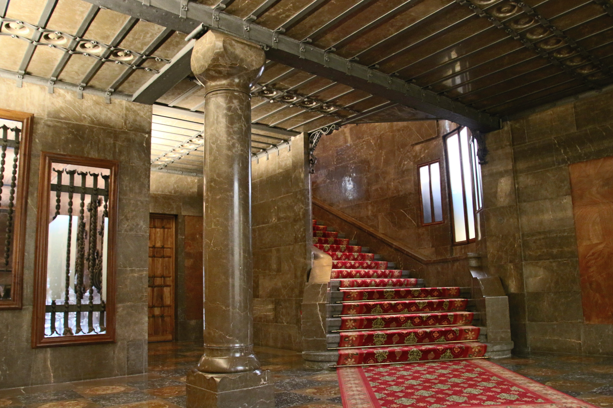 グエル邸はガウディがグエルのために設計した邸宅で、ガウディの初期の傑作。外観は厳かな石造りのデザインだが、内部に入るとガウディ特有の曲線美や自然をモチーフにした装飾が施されている。地下は馬小屋、1階は馬車庫、2階はパブリックスペース、3階は寝室、4階は使用人の部屋と厨房になっている。ユネスコの世界遺産にも登録されており、バルセロナの文化的遺産を象徴する重要な場所である。