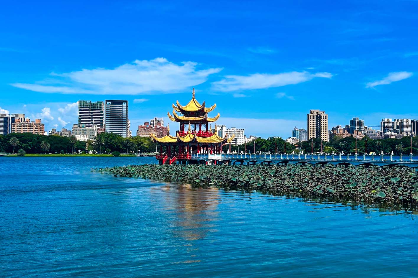 蓮池潭は、約7ヘクタールの面積を有する淡水湖で、池の中に廟が点在している。廟までは桟橋が伸びており、特に有名なのが龍虎塔。湖畔には遊歩道が整備されており、のどかな湖を眺めたり、廟を巡ったりしながら散策してみるのも楽しい。