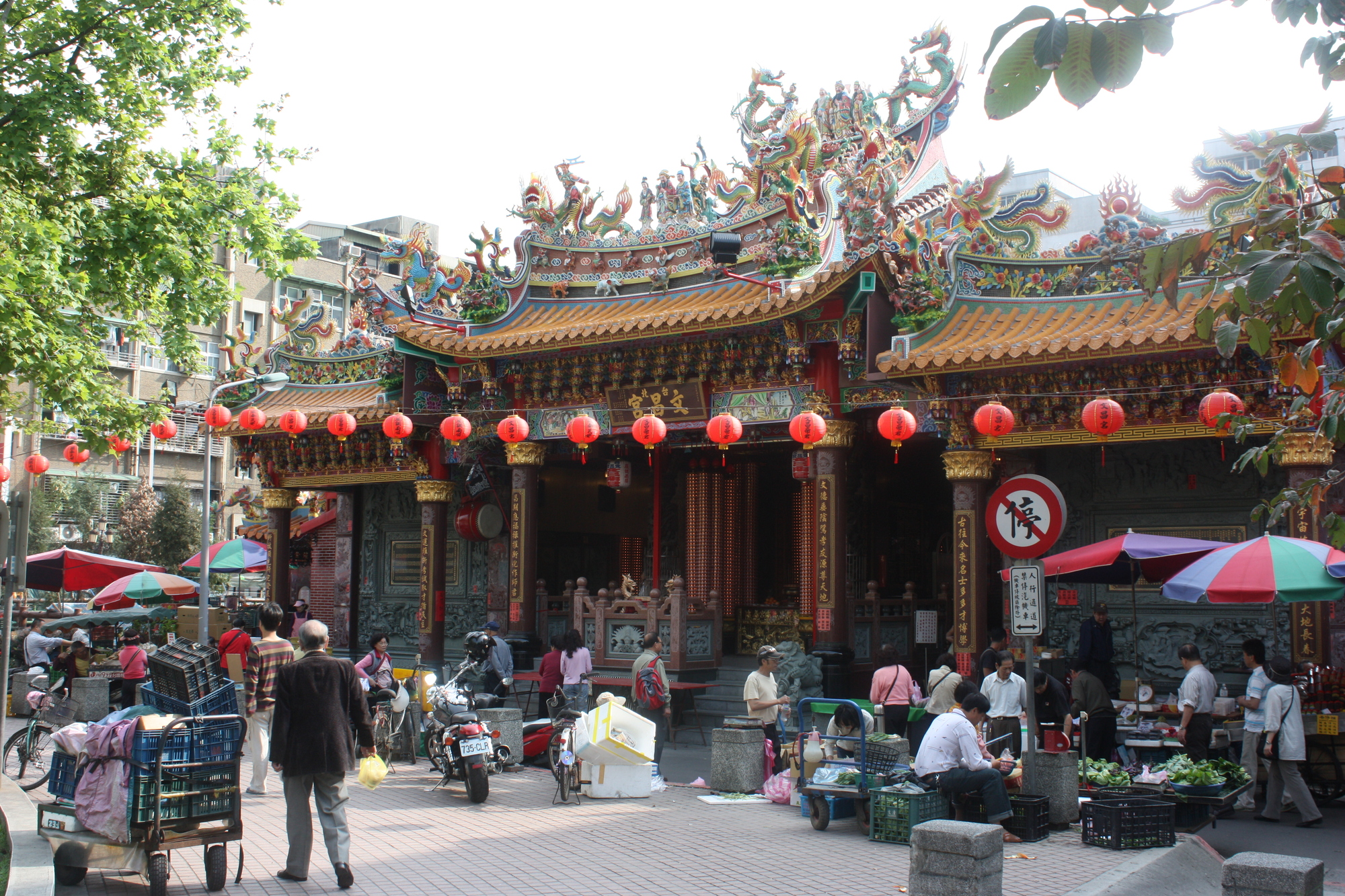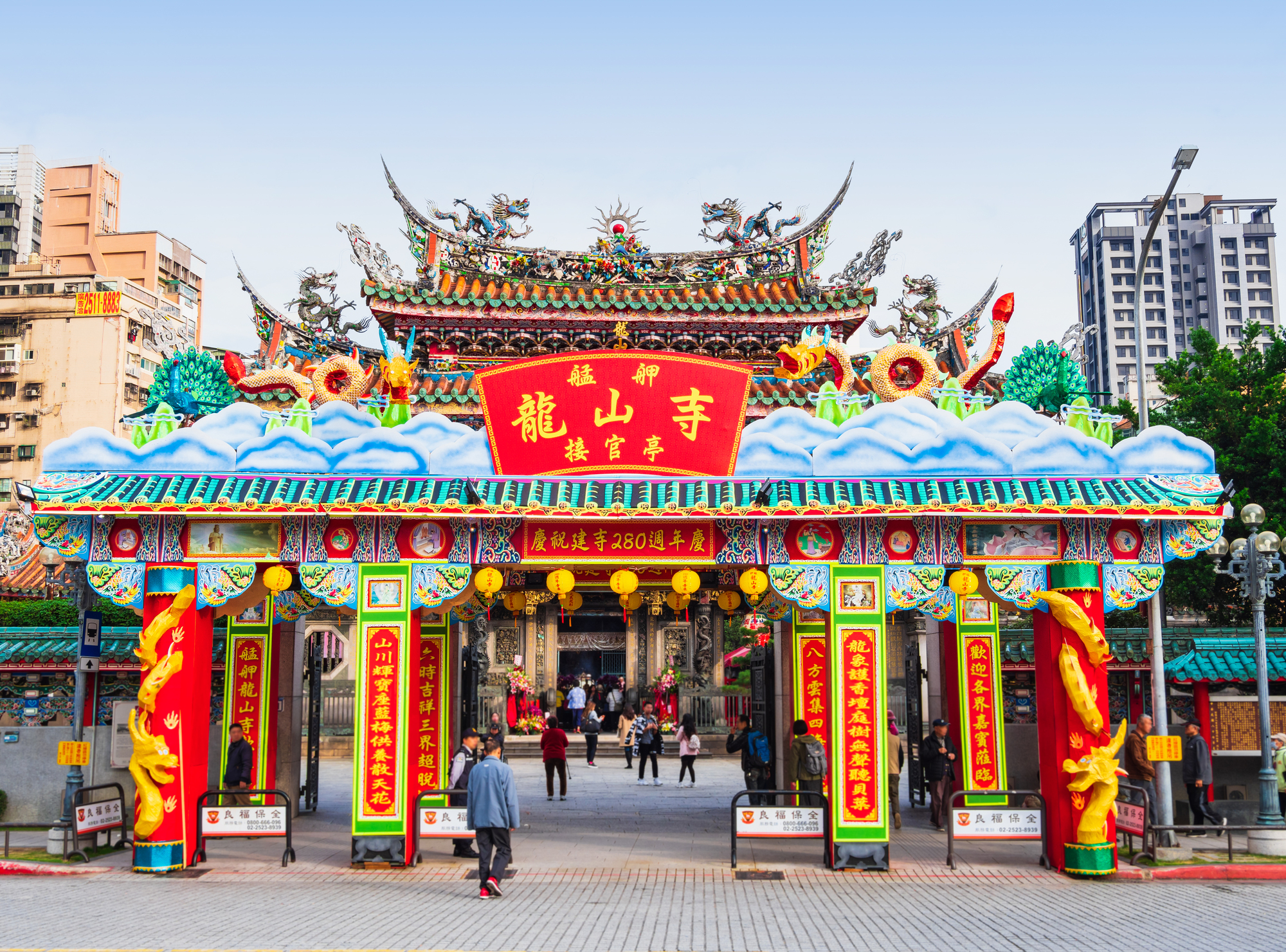 龍山寺はおよそ280年の歴史をもつ寺院。随所に龍のモチーフが見られ、彫刻や色鮮やかな装飾が見事。観音菩薩などが祀られており、多くの人々が参拝に訪れる。