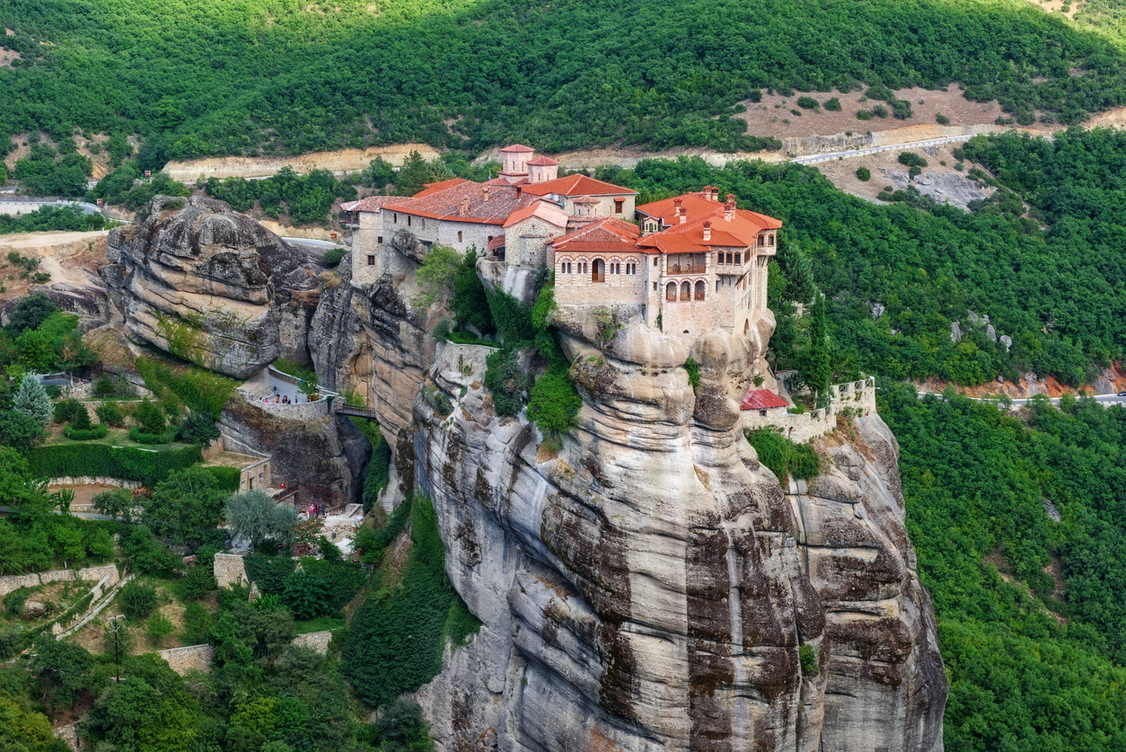 大地からそびえる奇岩群の上に築かれた修道院群。この神秘的な光景は、ギリシャのなかでも異質な雰囲気を醸し出している。メガロ・メテオロン修道院はメテオラで最大の修道院で、14世紀に建立されて以来、世界中の巡礼者や観光客を魅了してきた。ここからは、はるかかなたまで続く緑豊かな谷と山々が続く景色が広がる。修道院内部には、貴重な宗教画や装飾品が展示されており、古代の修道士たちがどのような生活を送っていたのかを垣間見ることができる。メテオラの静寂と神聖な空気のなかで、日常を忘れ、内なる平和を感じられる場所だ。