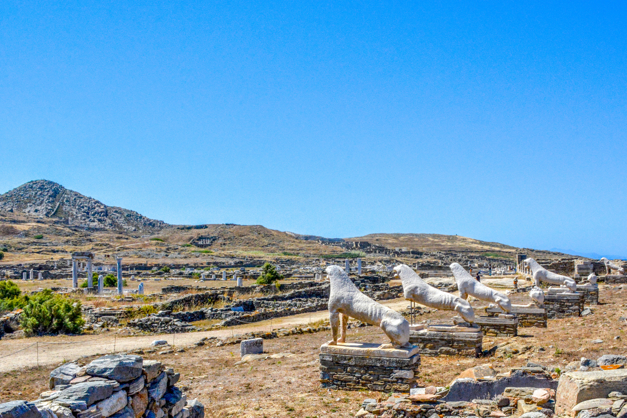 エーゲ海に浮かぶ小さな島ディロス(デロス)はかつて古代ギリシアの聖地とされ、多くの神話に登場する。1990年には島全体がユネスコの世界遺産に登録された。約2000年もの間、無人島となっており、日中のみ観光が可能。ミコノス・タウン内にある港からフェリーでアクセスできる。島には太陽神アポロンと月の女神アルテミスが誕生したとされる神殿や劇場、古代の住居跡などが広がり、荘厳さが漂う。また、聖域を守るように並ぶ7頭の『ライオン像』はディロス島の象徴的な風景のひとつで、訪れる者を過去の時代に誘う。ギリシア語で「輝く」を意味するディロスの海と遺跡が織りなす景色は、一度は見に行く価値がある。