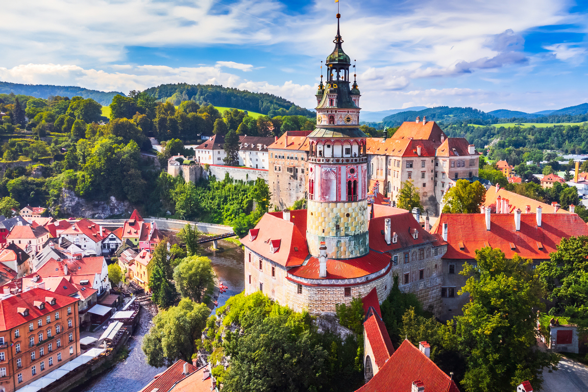 中世の町並みがそのまま残る町チェスキー・クルムロフにそびえるチェスキー・クルムロフ城は、1992年に世界遺産に登録された、チェコ旅行で外せないスポットだ。ヴルタヴァ川に囲まれた丘の上に位置し、13世紀に創建された後、数世紀にわたり増改築が繰り返されてきた。40の建物と宮殿から構成され、その規模は中央ヨーロッパ最大級。ルネッサンスとバロック様式が融合した建築美が特徴で、内部の豪華なインテリアや美術品が豊富に展示されている。城からの眺めも美しく、塔に上れば町を一望できる。城を巡る英語のガイドツアーも開催されている。