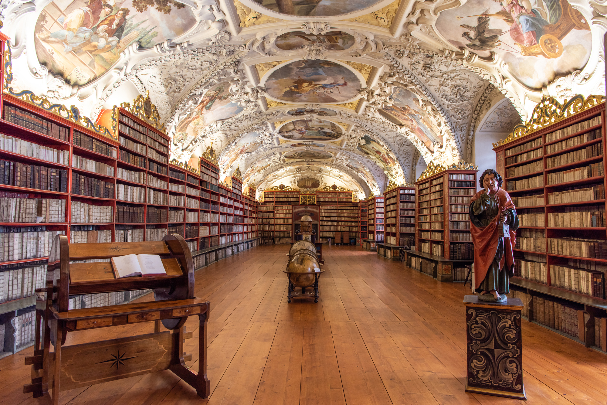 プラハの西側の丘に位置するストラホフ修道院は、12世紀に創建された歴史ある修道院で、特にその壮麗な図書館が世界的に有名だ。「哲学の間」と「神学の間」と呼ばれる2つの図書室は、壁一面に収められた蔵書とバロック様式の天井画が見どころ。「神学の間」には地球儀と天文地球儀が並び、時を超えた知識の重みを感じさせる。修道院内にはホスポダ(ビアホール)もあり、歴史的な雰囲気のなかで味わう地ビールは格別だ。静けさのなかで過ごす時間は、喧騒から離れて心を落ち着けるのに最適だ。
