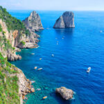 ナポリ湾に浮かぶカプリ島は、美しい海岸線と青く澄んだ海が特徴の島で、何といっても青の洞窟が見どころ。洞窟内に差し込む陽光が海水を透かし青く輝くさまは、息をのむほど美しい。洞窟の狭い入口を船で通り抜けるので、少しスリリングな体験だが、それを乗り越えた先にある感動はひとしおだろう。また、島全体に広がる美しい自然や、高級感漂う町並みも見どころ。