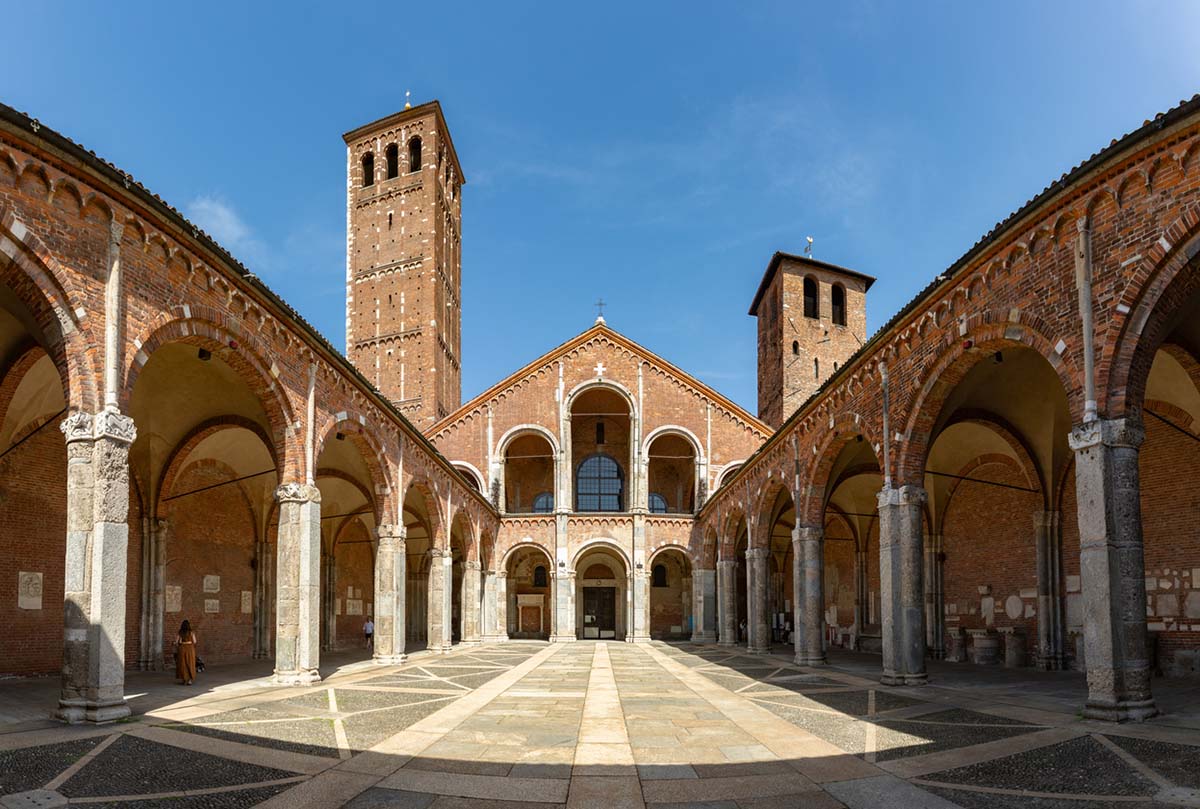 サンタンブロージョ聖堂は、4世紀に建立された、ミラノの守護聖人である聖アンブロージョを祀る教会。内部には、宝石などで装飾された黄金祭壇があり、祭壇の上部には金色の漆喰で祭壇天蓋が描かれている。