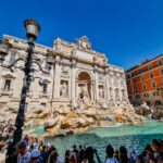 トレヴィの泉は、バロック芸術の傑作と称されるほどの美しさを誇る噴水。ニコラ・サルヴィにより設計され、1762年に完成した。まるで絵画から飛び出してきたかのような彫刻は、中央に躍動感あふれる海神ネプチューンとトリトンがそびえ立つ。「トレヴィ」とは、泉の前から延びる「三差路」に由来している。なお、噴水の縁に座るのは禁止されているので注意しよう。