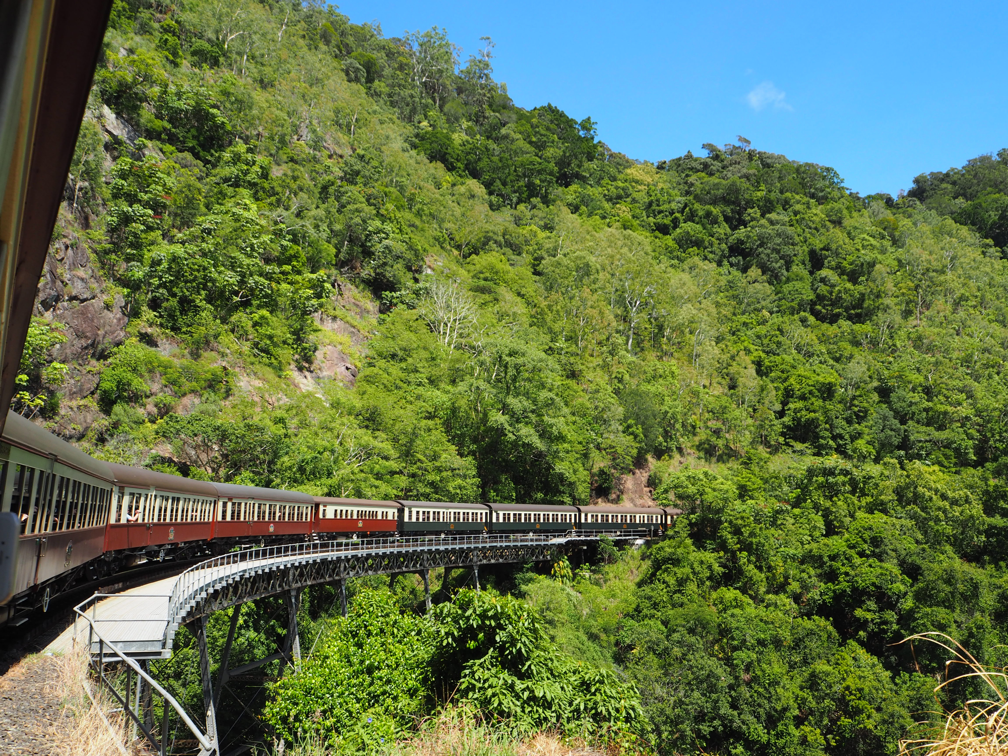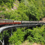 キュランダ・シーニックレールウェイは、ケアンズからキュランダまでの絶景を楽しむことができる観光列車。熱帯雨林を縫うように走りながら、美しい滝や谷を眺めることができる。
