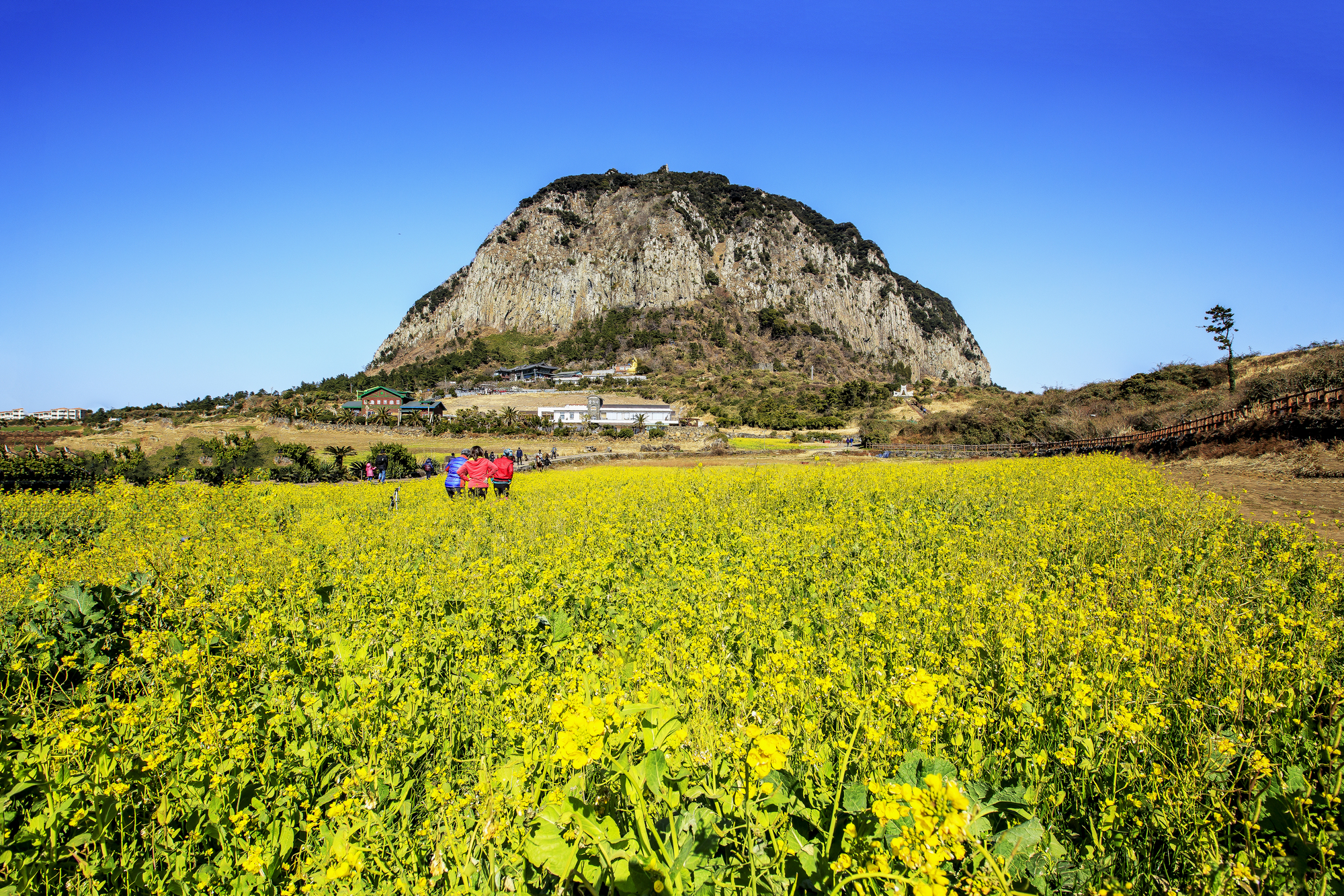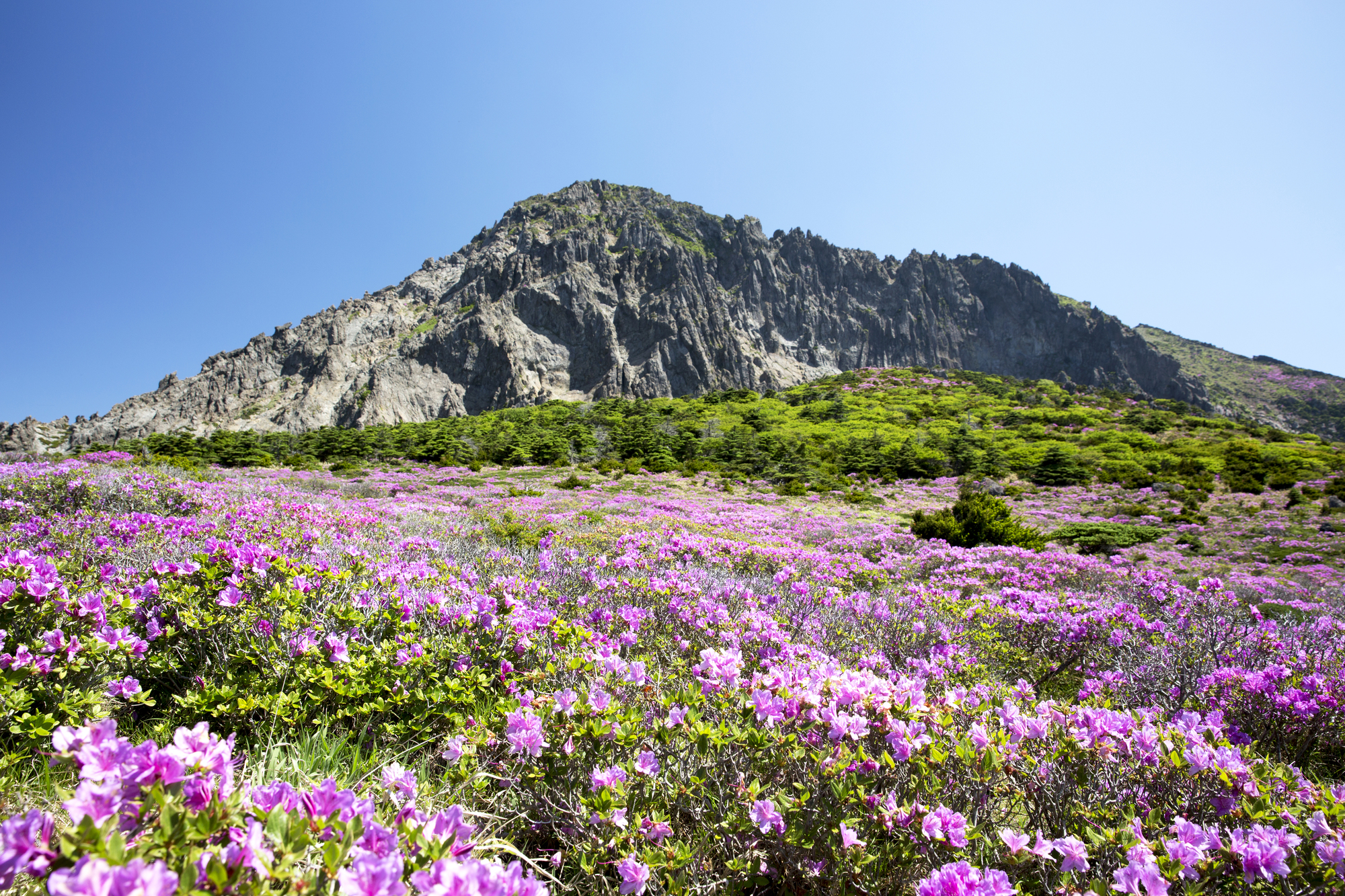 漢拏山は、ユネスコの世界自然遺産にも登録されている韓国最高峰の山。済州島の中央にそびえ、漢拏山の噴火により島が形成された。標高1950mの山頂には火山湖である白鹿潭(ペンノッタム)が広がっている。初夏にはヤマツツジ、秋には紅葉など、四季折々の風景が楽しめる。