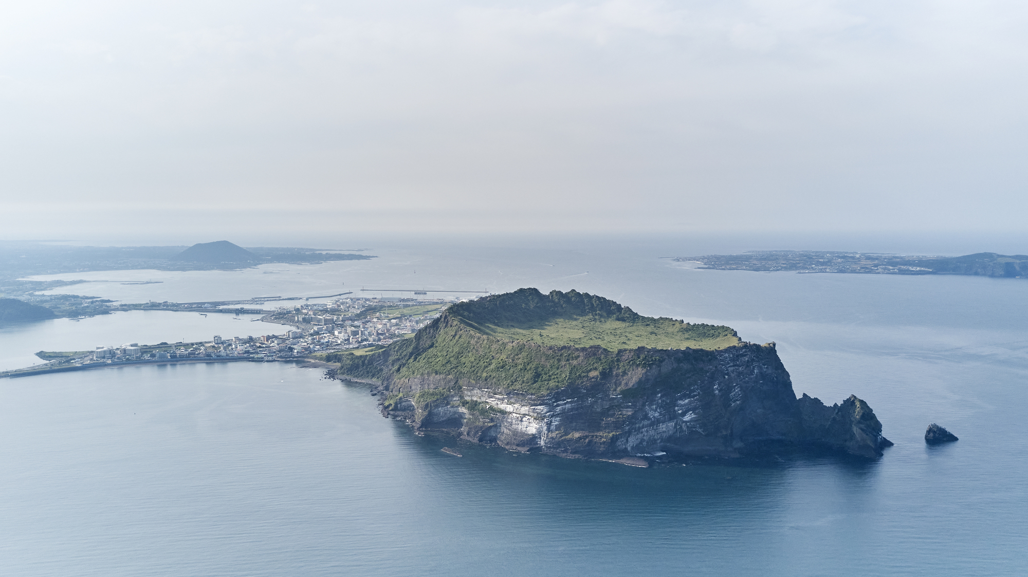 城山日出峰は、済州島を象徴する景勝地のひとつで、ユネスコの世界自然遺産にも登録されている。約10万年前の海底火山の噴火により形成された山で、最東端に突き出た特徴的な形をしている。日の出の鑑賞スポットとしても知られており、太陽が昇り始めるとまるで絵画のような光景が広がる。
