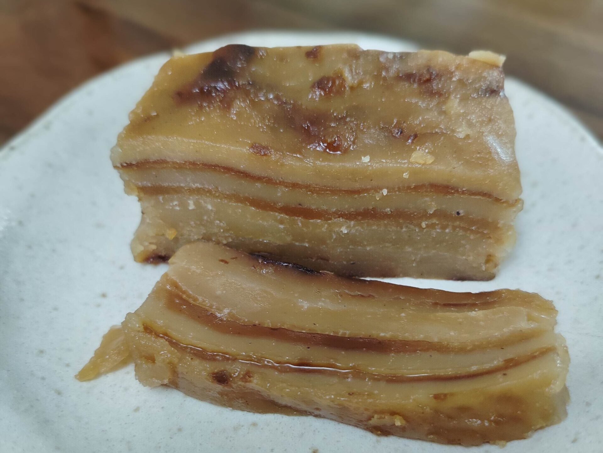 インドのシーフードもいいですが、お土産に持って帰れるゴア名物には何があると思いますか? 第一に、ゴアはカシューナッツが有名です。街の至るところに、カシューナッツを売る店があります。そんなお店に入ってみると、多様な風味のカシューナッツに加え、「Bebinka(べビンカ)」という商品が並んでいます。ゴア特有のスイーツです。小麦粉やココナッツの生地を何層にも重ねた、「ういろう」のような食感のお菓子です。ポルトガル領時代にゴアにいた修道女の名前に由来しているといわれています。