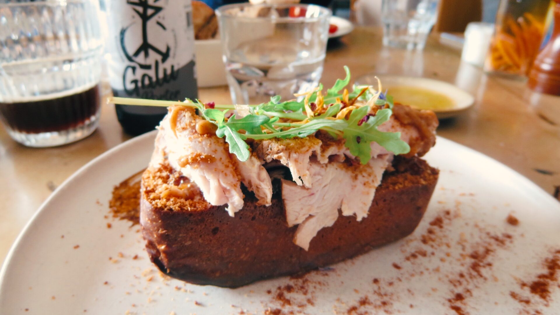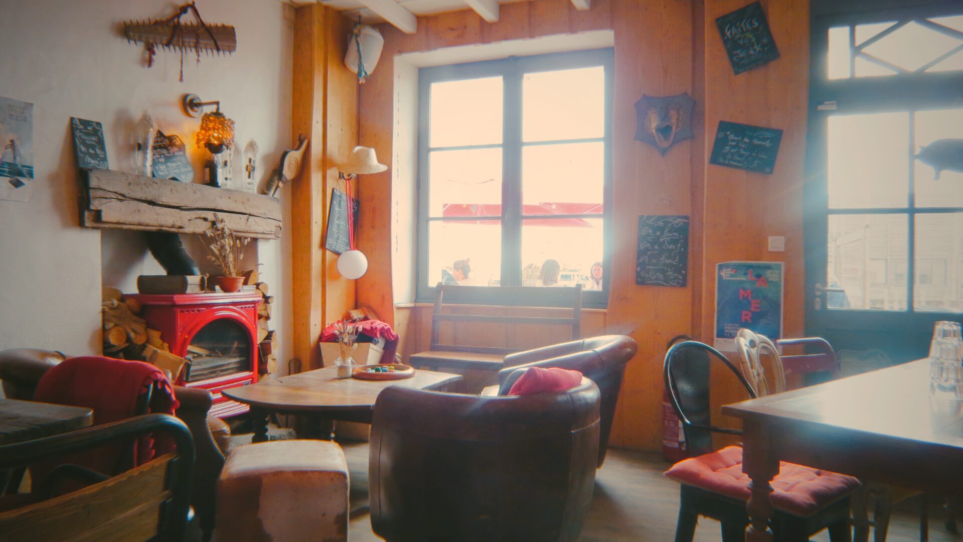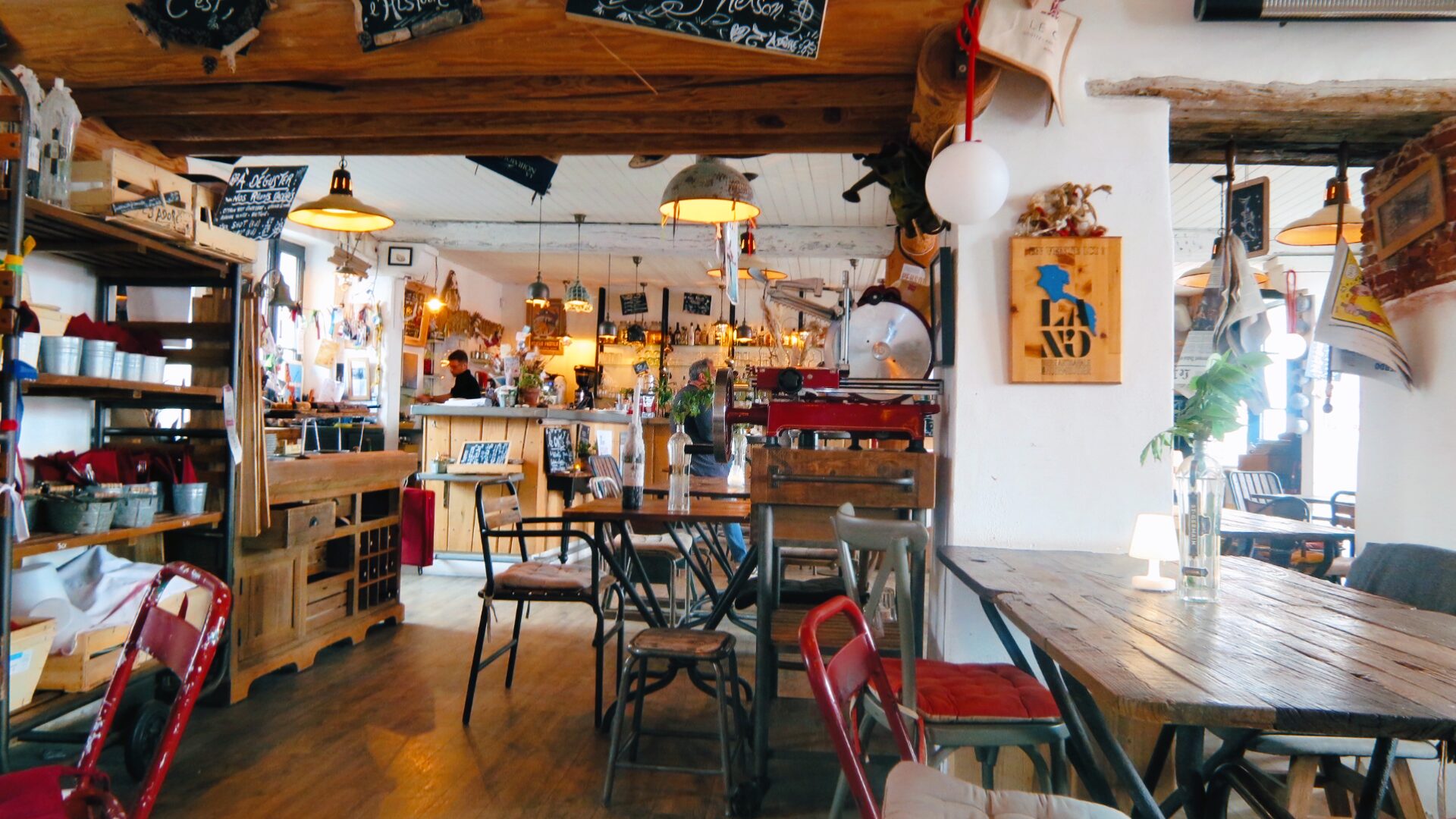 Restaurant le 11(レストラン・ル・オンズ)の店内の壁にはメニュー?と思いきや、ただ陽気なメッセージが書かれているボードやポスターがたくさん掲示され、棚にも所狭しと雑貨やおもちゃが。この、おしゃれだけど脈絡のないインテリアに「人ん家」感があふれており、座っているだけで大変楽しくほっこりします。