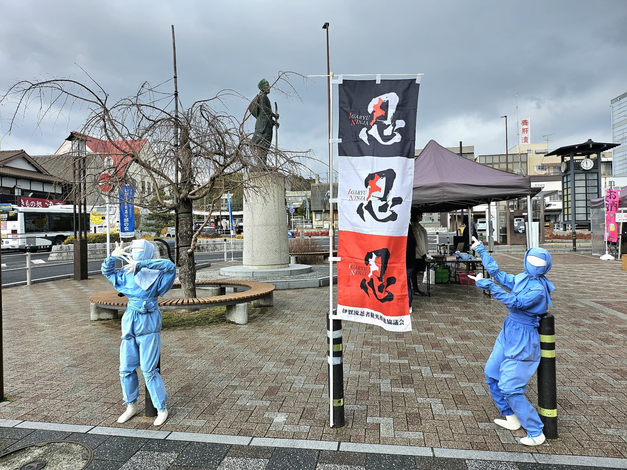 2月22日はニン・ニン・ニンで忍者の日ということで、2月は忍者月間だそう。その忍者月間を盛り上げるため、上野市駅の駅前広場では2月16日(にんむ)と22日(にんにん)に「忍マルシェ」が開催されていました。