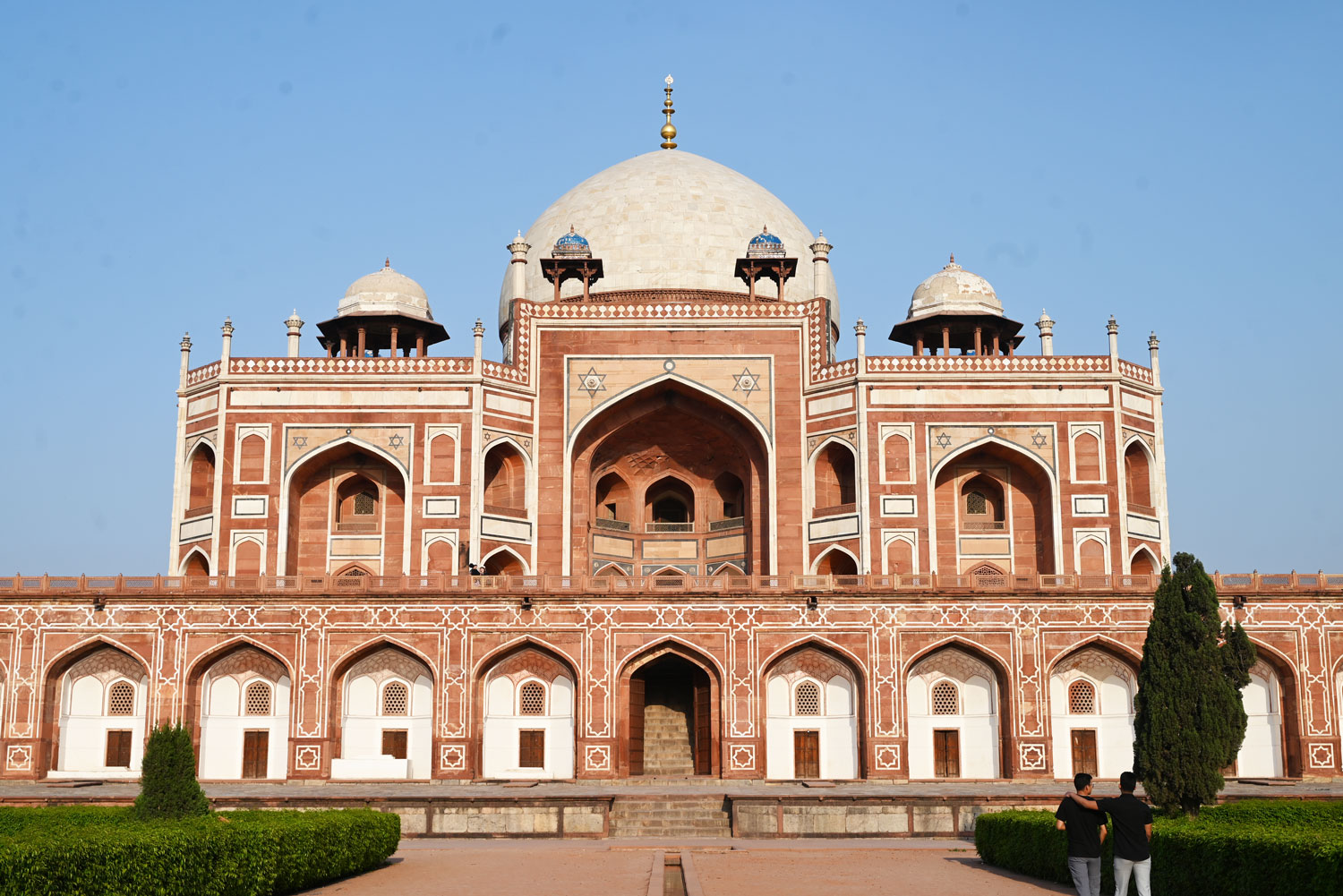 デリー中心部に位置するフマユーン廟は、ムガル帝国第2代皇帝フマユーンの妃ハージ・ベグムが夫の死後建築させた。インド・イスラーム建築の傑作として1993年に世界遺産に登録されたこの廟は、赤土の壁と大理石のドームの組み合わさった美しい建物が庭園の中央に配され、ムガル様式の礎となるスタイルをインドで初めて取り入れた墓廟。およそ100年後に建てられたタージ・マハルのデザインにも影響を与えたといわれる。天井、透かし窓の幾何学模様など、タージ・マハルと見比べてみるといいだろう。ペルシア様式を色濃く反映した四分庭園も含めて、どの方向から見ても完璧なシンメトリーを構成しており、夕暮れ時に赤く染まるフマユーン廟はまるで絵画のように美しい。