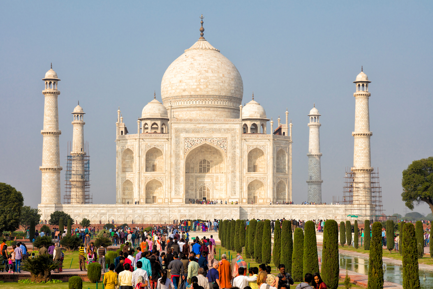 世界遺産として最も有名なタージ・マハルは、ムガル帝国第5代皇帝シャー・ジャハーン帝が亡き妃ムムターズ・マハルのために建てたお墓だ。彼は22年もの歳月と莫大な費用をかけて愛を表現。この美しい白大理石の霊廟は、建築美の極致とされている。昼間は圧倒的な存在に見えるタージ・マハルは、夜間には月の光に照らされ、現世のものとは思えないようなあやしげな美しさを放つ。滞在中には、ぜひふたつの顔を味わってほしい。メインゲートの赤砂岩の大楼門をくぐり見えるのは、天界をモチーフにした世界最大規模のペルシア式宮殿。旅人たちはその庭園、宮殿の完璧なシンメトリックなデザインに感動を覚えるだろう。