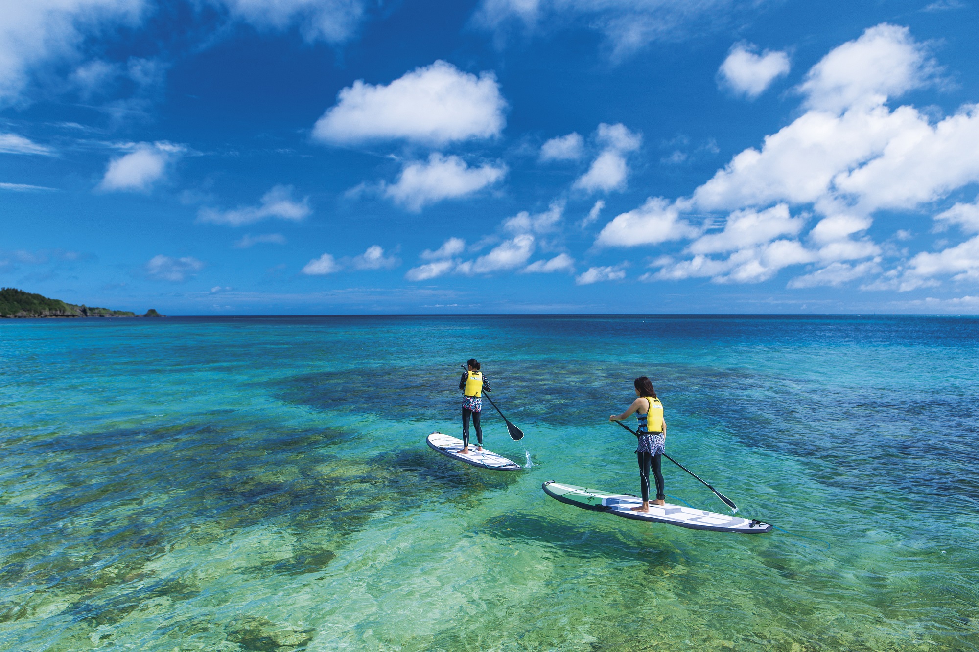 浮力の高いボードに乗り、パドルを漕いで水面を進むマリンスポーツ「SUP(サップ)」。ボード上でバランスを取りながら進むのも楽しく、しゃがめば海面とも近くなり開放感抜群! 1時間、5000円。(5月1日~9月30日開催)