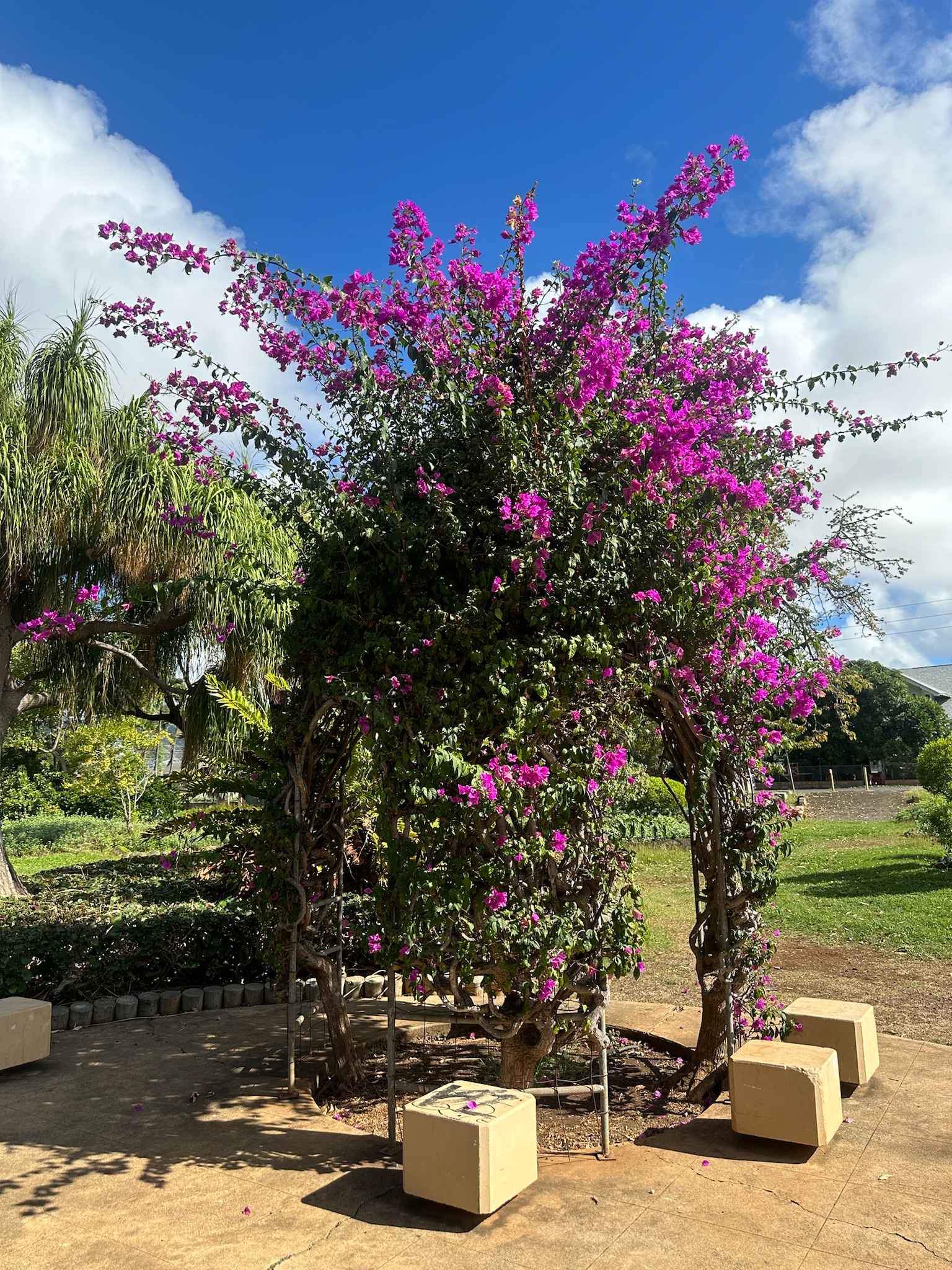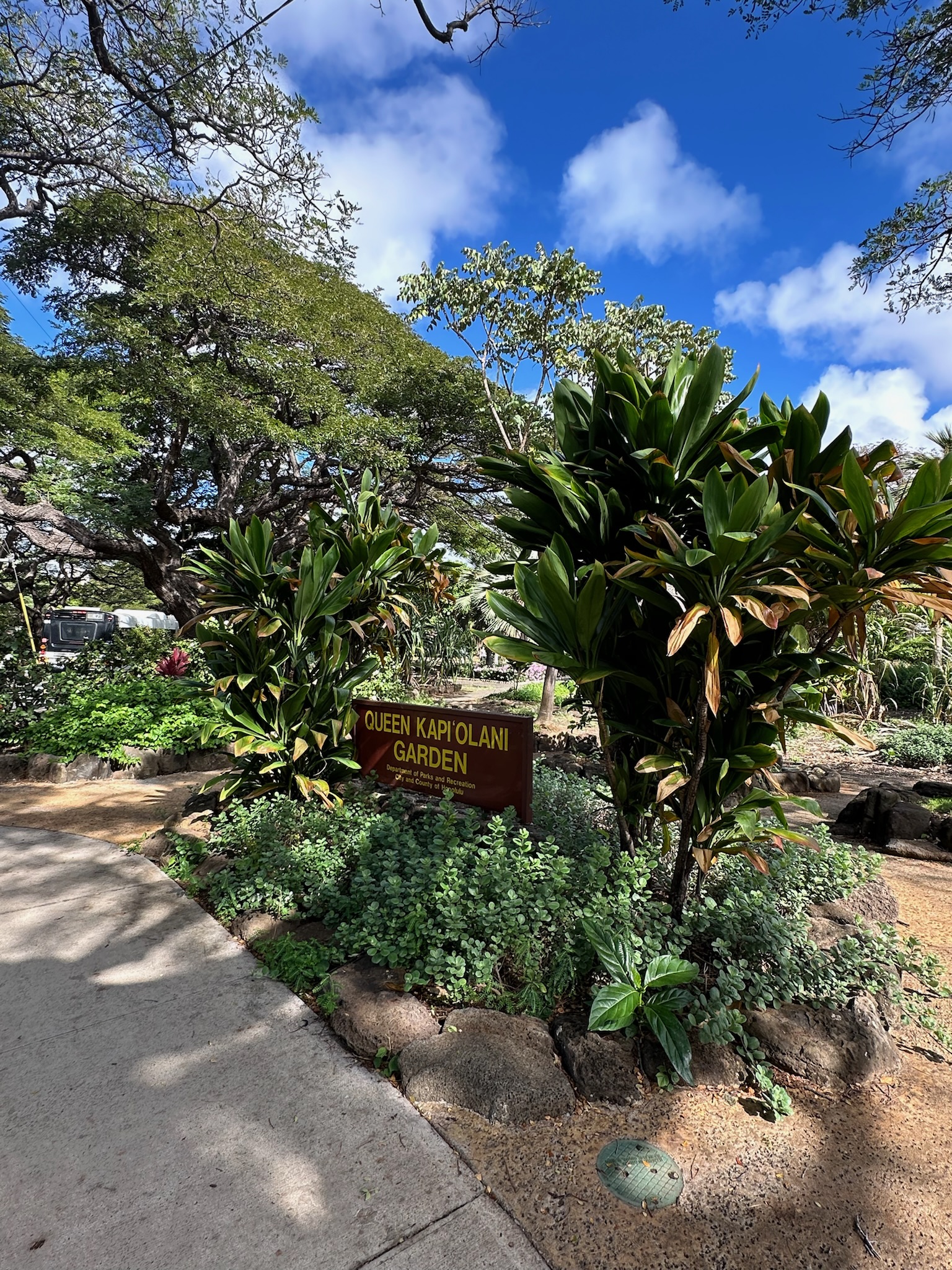 歩いていると、右手にブーゲンビリアや色とりどりの花々が目に飛び込んできます。ここは、1972年に開園した歴史ある「クイーン・カピオラニ・ガーデン」。クイーン・カピオラニ公園の一角にある静かでのどかな憩いの場。ハワイ固有の植物や亜熱帯植物を楽しめます。特に 5月~10月ごろには、プルメリアやハイビスカスが満開になり、華やかでフォトジェニックに。
