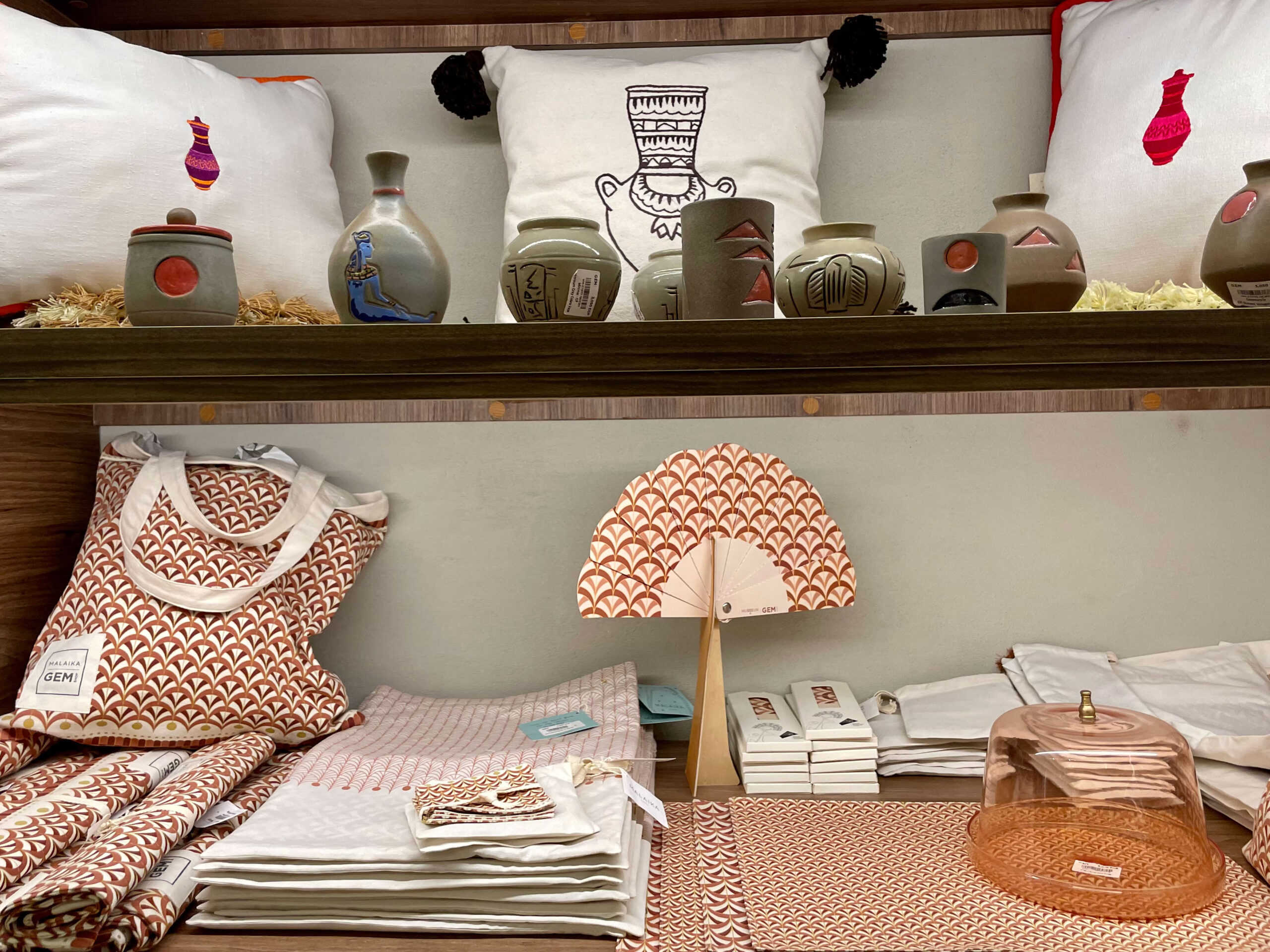 じっくり見学したあとは、1階のミュージアムショップでお買い物タイム! 置物や食器などの日用品やエジプト綿を使った衣類やストール、おしゃれなデザインのクッションなど、自分用にも家族・友人用にもぴったりな品々が並んでいます。実は最近旅先での物欲がそれほどなくなってきた筆者ですが、センスのよい品揃えとここでしか手に入らないアイテムに買い物熱が高まり、気づけばツタンカーメンのTシャツとエコバッグ、キーホルダーなどを握りしめておりました。Tシャツはしっかりした厚手の生地で着心地もよく、エジプト滞在中に大活躍!