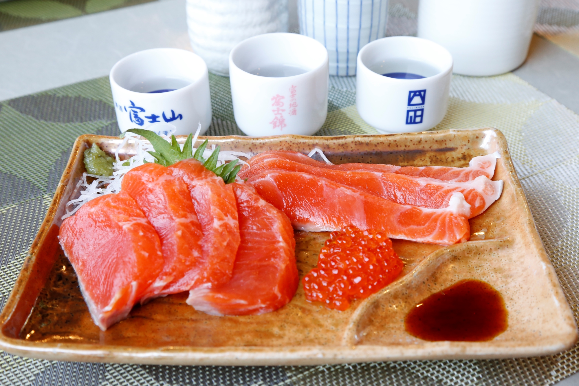 旬の食材や地元の食材を活かした料理が人気で、もちろん上で紹介した牧野酒造や富士錦酒造など、地元の酒蔵のお酒もスタンバイ。この日頂いたのはニジマスのお刺身と富士宮の根原地域で取れるブランド大根「根原大根」の煮物、シラスと桜エビのピザなど。