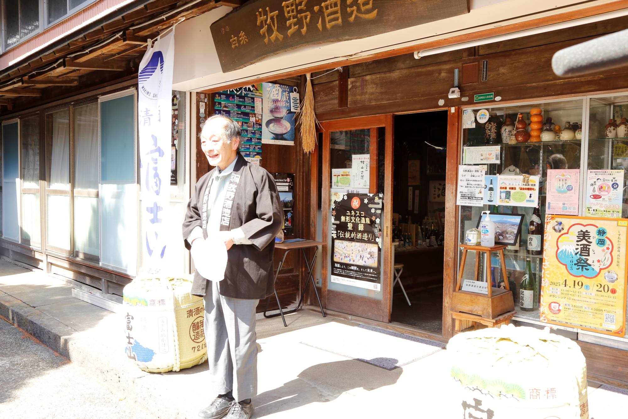 県の施設で学んだあとは実際に酒造りが行われている場所を訪れてみました。まず訪れたのは1743年から酒造りを行っている富士宮市の「牧野酒造」。富士山の伏流水を仕込みに使い、酒米をすべて手洗いで処理するなど、今も伝統的な手法を守っています。蔵元の牧野利一さんによると、牧野酒造周辺は酒に適したお米が取れ、伏流水が豊富、冬は冷たい環境でお酒の発酵を抑えることができる酒造りに適した環境なのだとか。