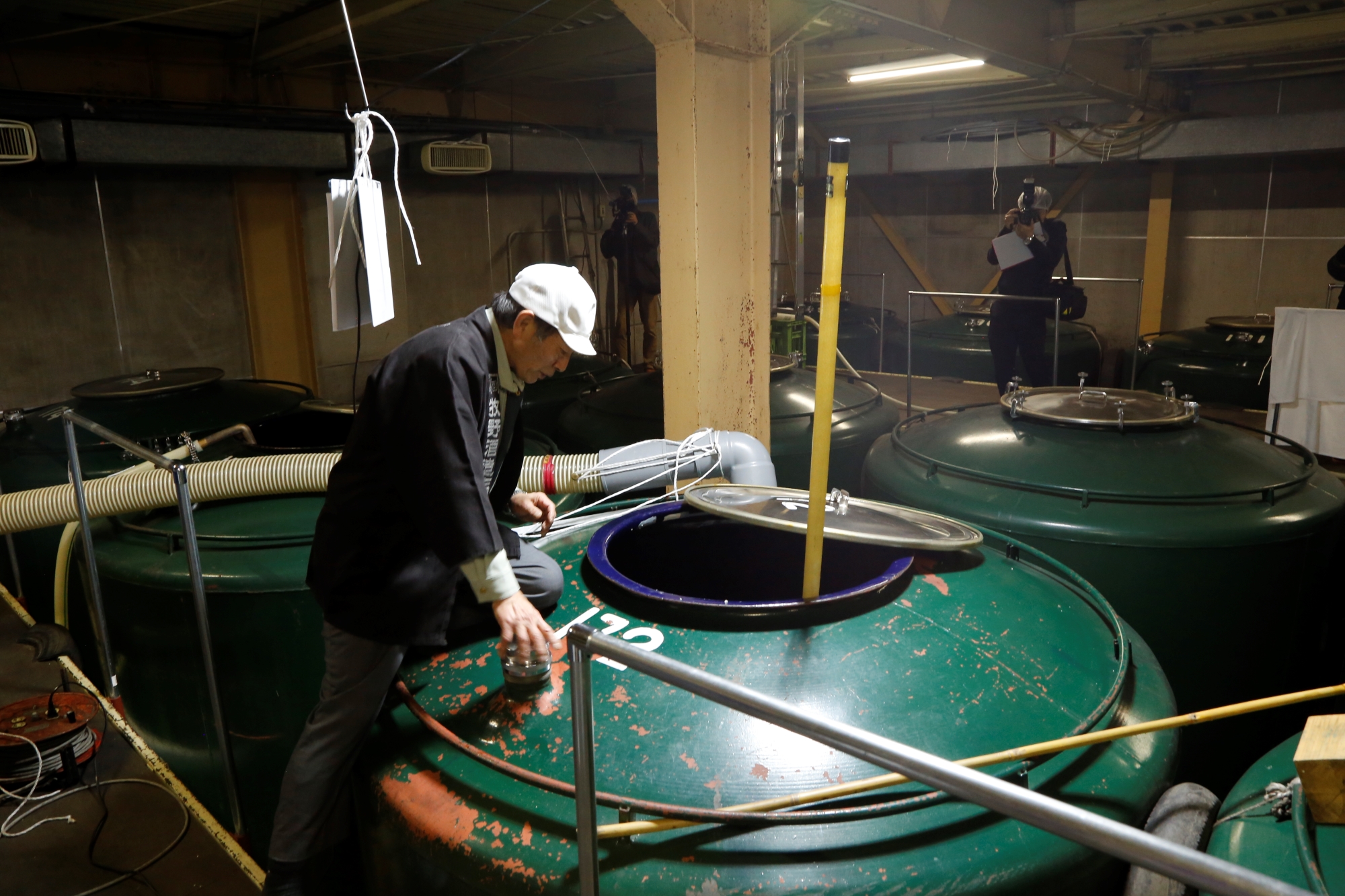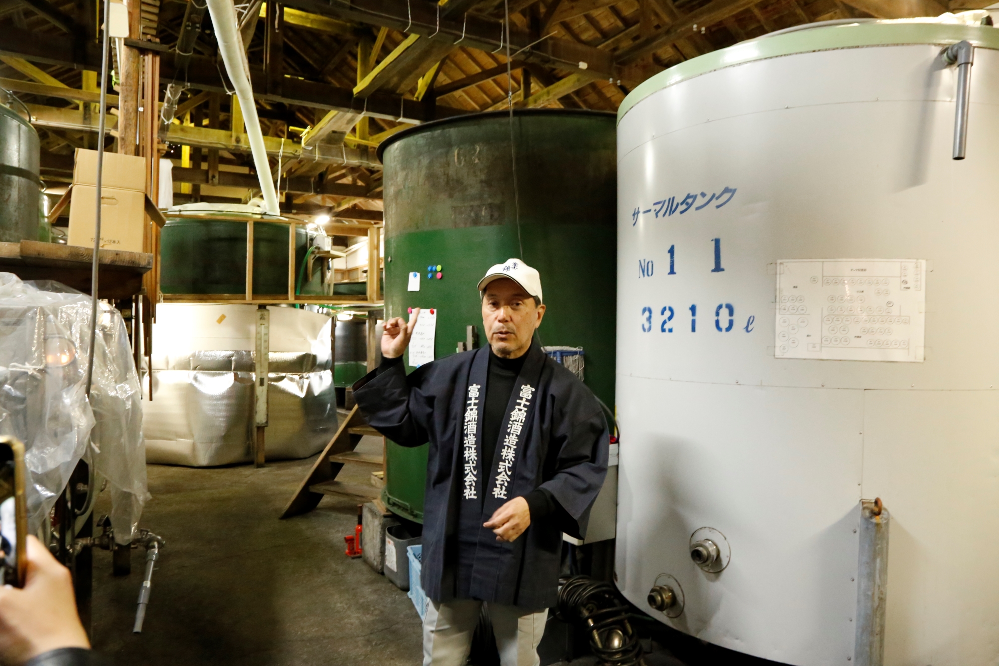 代表の清信一さんに昭和2年に建てられたという100年近い酒蔵を案内していただきました。清さんはもともと神奈川県横浜市で暮らすサラリーマンでしたが、勤務中に奥さまの実家である富士錦酒造の跡継ぎとして活躍されていた義兄を交通事故で亡くします。そして酒蔵を継ぐために東京の会社を辞め、東京農業大学醸造科に入学、富士錦酒造株式会社へ入ったという経歴をおもちの方。優しく落ち着いたご説明のなかに、独特のユーモアと知識を交え、見学中も参加者の笑いと驚きが絶えません。