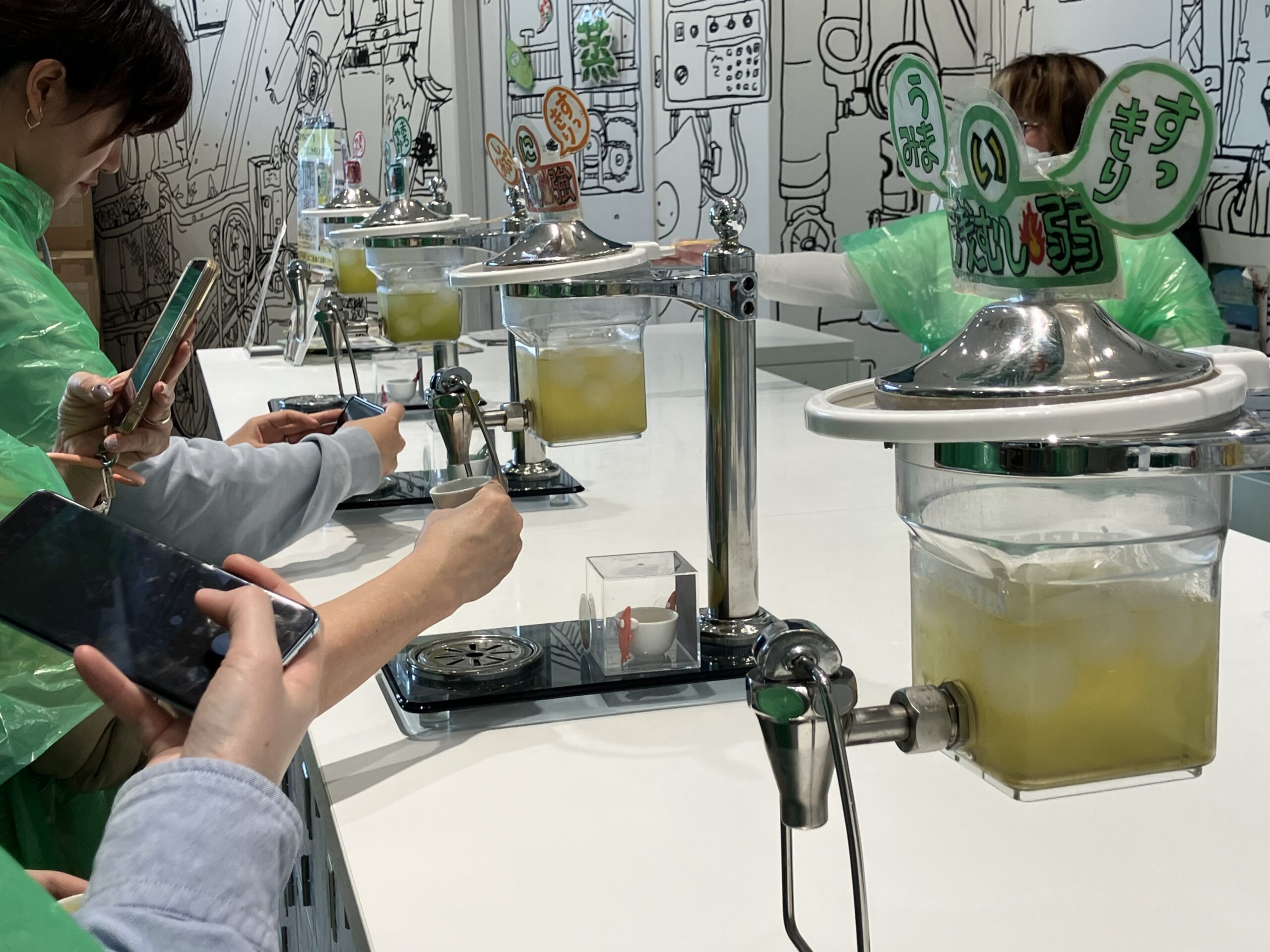 ツアーで茶葉の気持ちになりきった後は、緑茶の飲み比べ。蒸し時間と火入れ時間の組み合わせを変えた4種類を順番にいただきます。同じ茶葉であっても、蒸し時間と火入れ時間の組み合わせで味が大きく異なることがわかります。