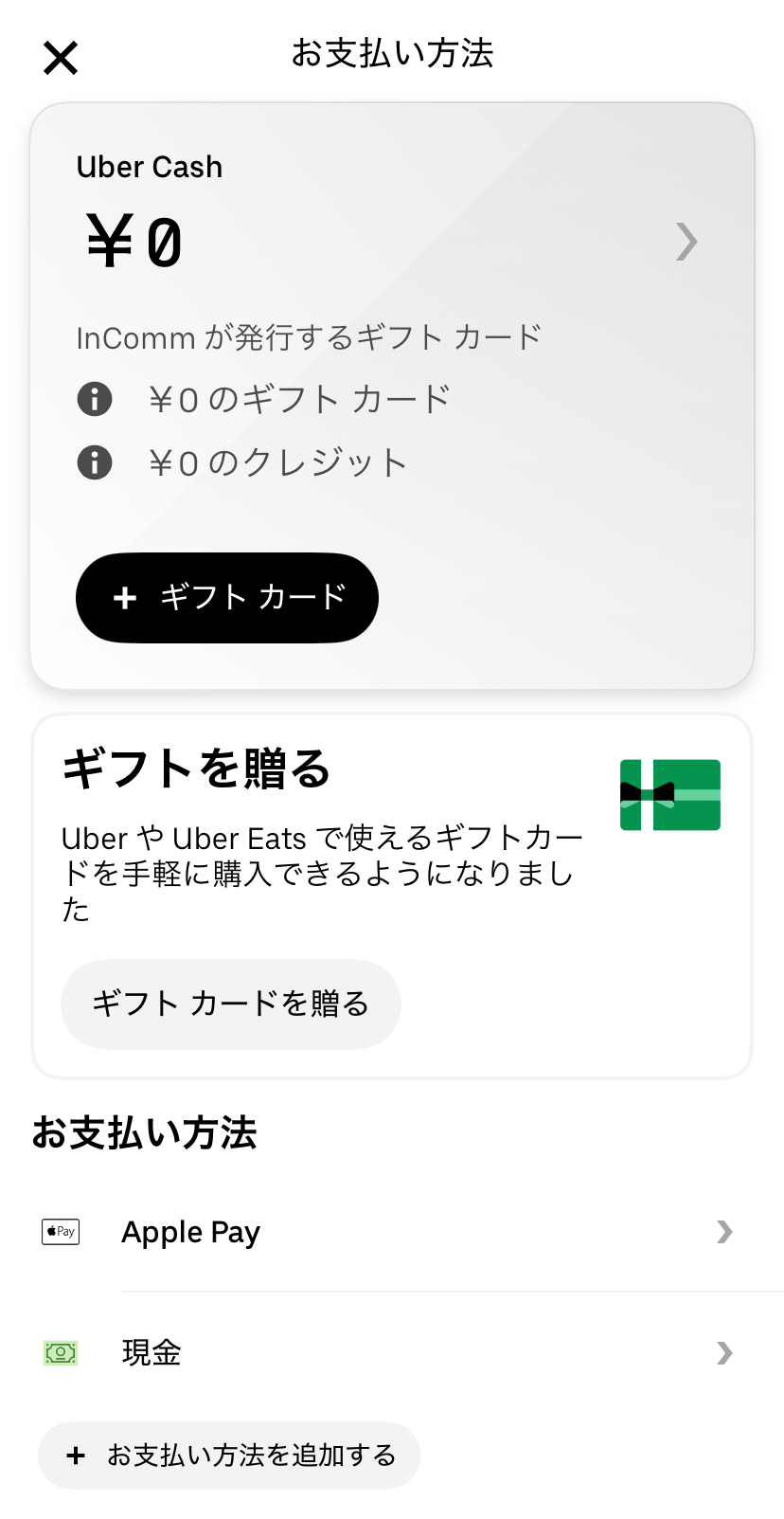 「アカウント」情報から「お支払い方法」を選ぶと、デフォルトでApple Payと現金が登録されています。「お支払い方法を追加する」を選択すると、クレジットカードやデビットカードなどを登録できるので、希望の支払い情報を追加しましょう。