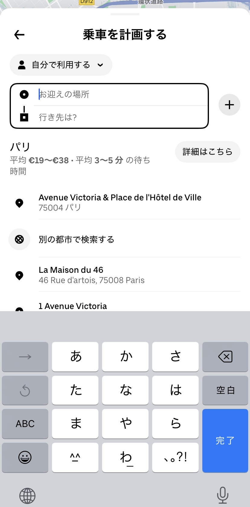 まずは、アプリのホーム画面にある「配車を依頼」をタップし、「お迎えの場所」に乗車場所である「パリ北駅」と入力し、「行き先は?」に目的地の「エッフェル塔」と入力します。この時、日本語・フランス語どちらで入力しても問題ありません。