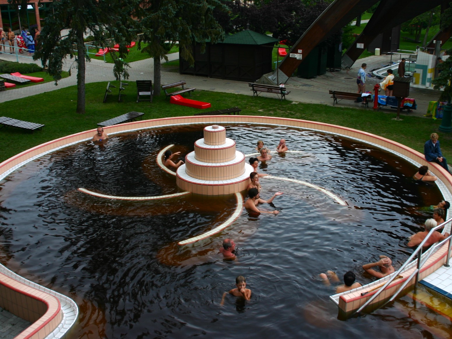 ヨーロッパでは源泉をろ過して湯の華などを取り除き、塩素消毒を加えて浴用に使う国が少なくありません。ハンガリーでは源泉をそのまま使用している施設が大半で、これはとても珍しいことです。ろ過・消毒している場合も、それとは別に源泉プールを備えている施設が多くあり、温泉そのものの良さを楽しむこともできます。