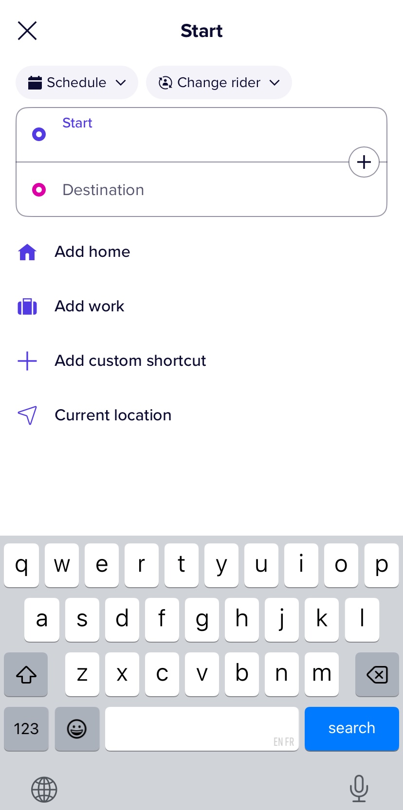 まずは、アプリのホーム画面下にある「Rides(乗車)」をタップし、「Start(乗車場所)」に「Union Station」、「Destination(目的地)」に「Santa Monica Place」と入力します。