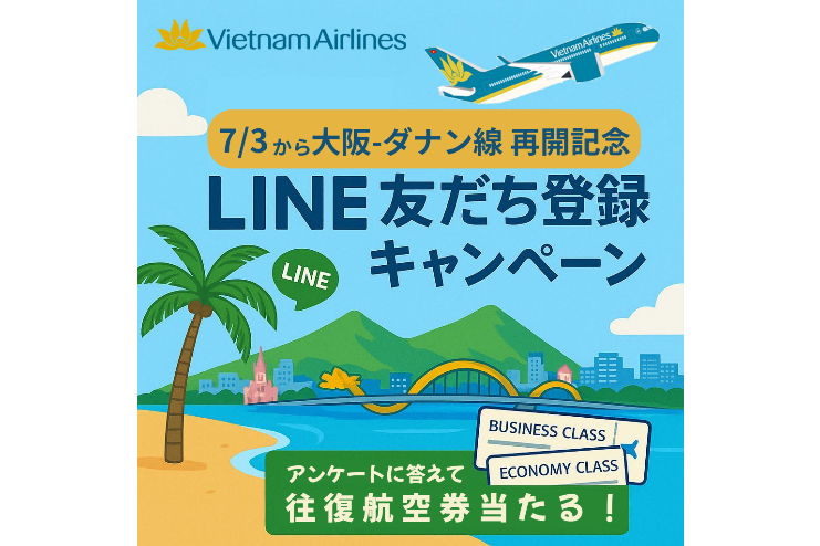 「LINEお友達登録キャンペーン」は、2025年7月3日(木)よりベトナム航空の大阪-ダナン線が再開することを記念したキャンペーンで、抽選で日本発ベトナム行きの無料往復航空券やオフィシャルグッズが当たるというもの。