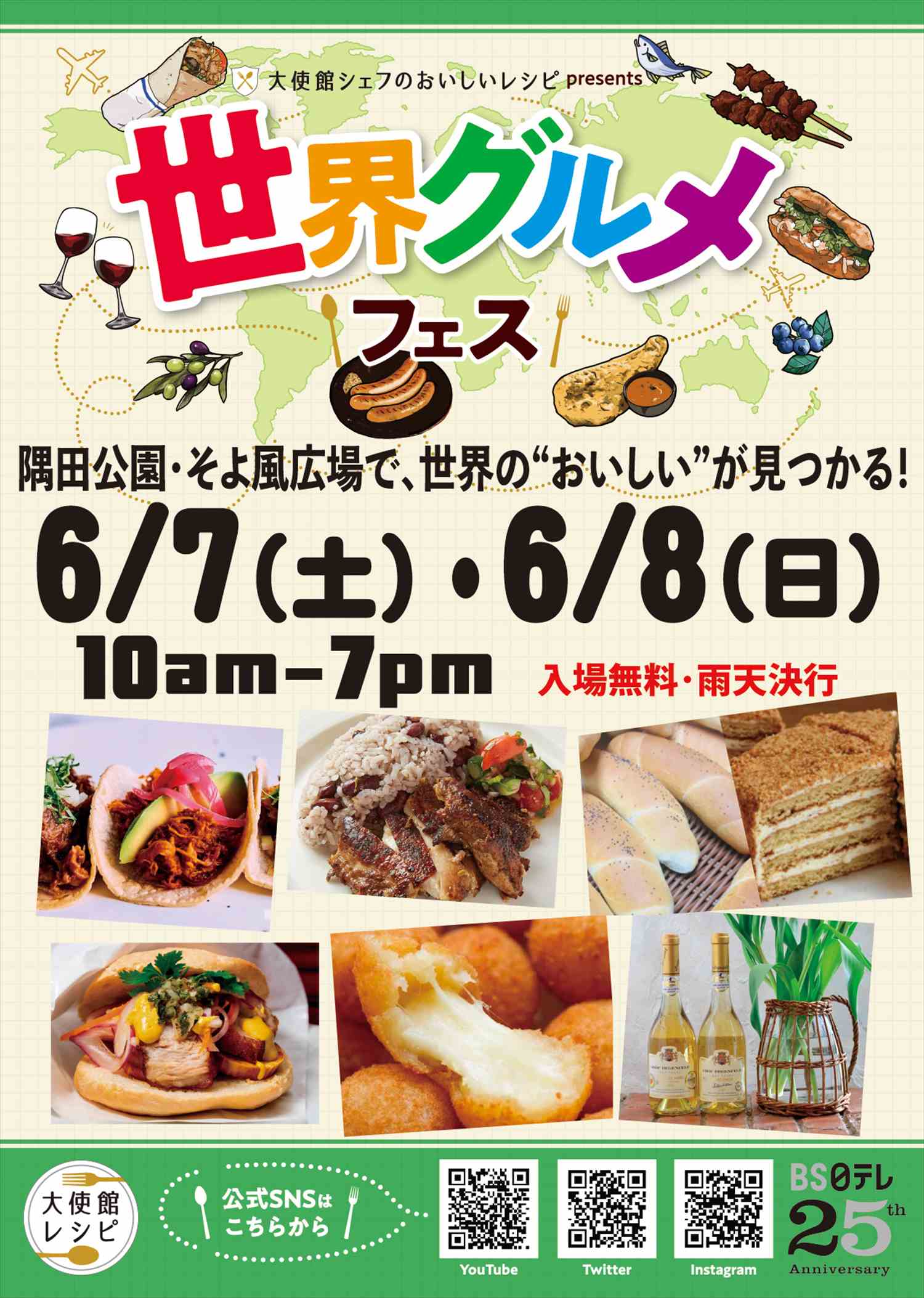 「世界グルメフェス」は、2025年6月7日(土)~6月8日(日)まで墨田区の隅田公園で開催される、世界の本格料理を堪能できるイベント。BS日テレの開局25周年記念イベントとして、人気YouTubeコンテンツ「大使館シェフのおいしいレシピ」と連動しながら、大使館が紹介する本格派レストランの料理や人気のキッチンカーなどが集結します。アメリカやドイツ、ペルー、ベトナムなど10ヵ国以上のグルメを楽しめます。