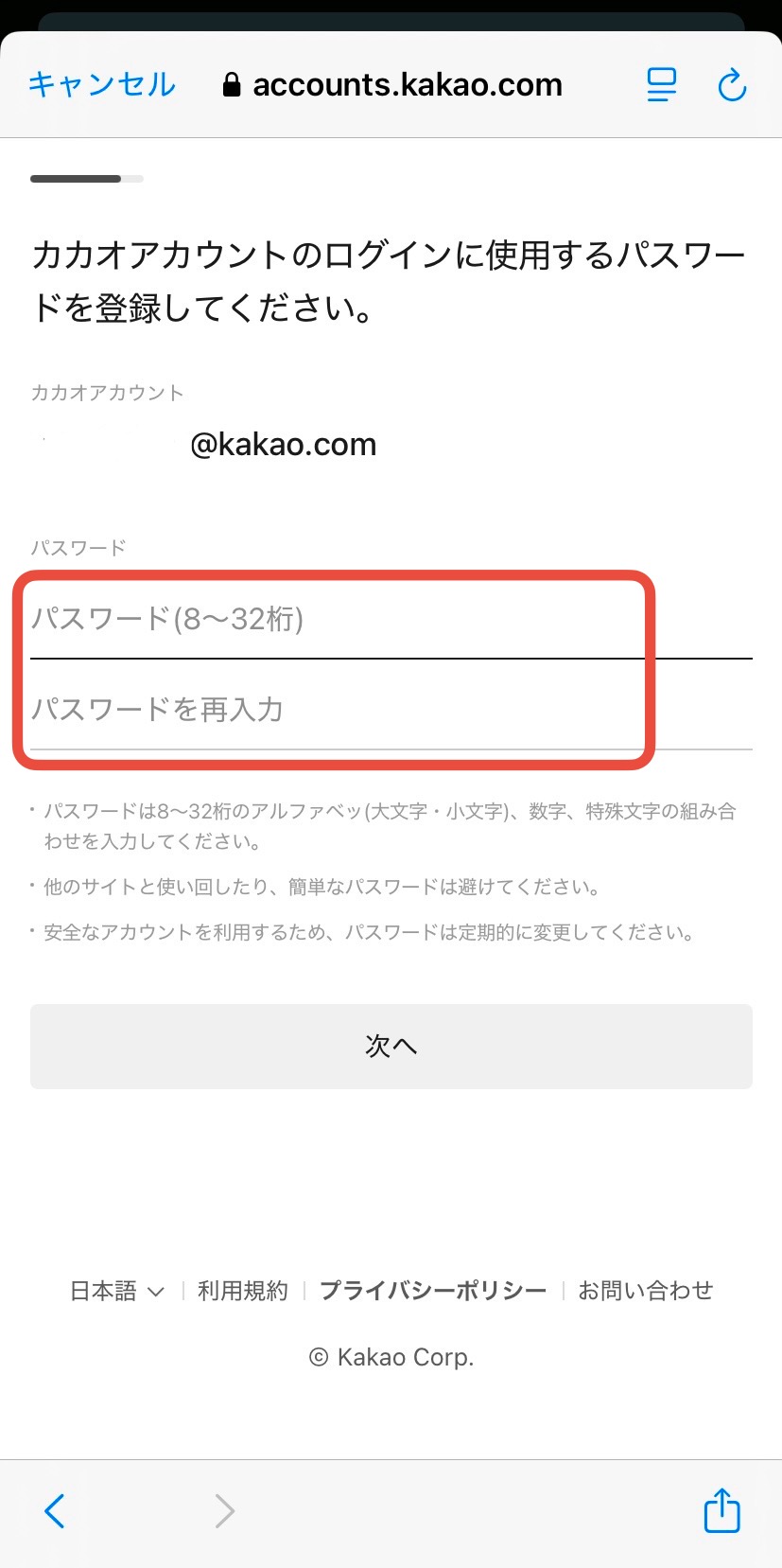 続いて、カカオアカウントのログインに使用するパスワードを設定します。パスワードは8~32桁で、アルファベット(大文字、小文字)、数字、特殊文字の組み合わせで作成します。