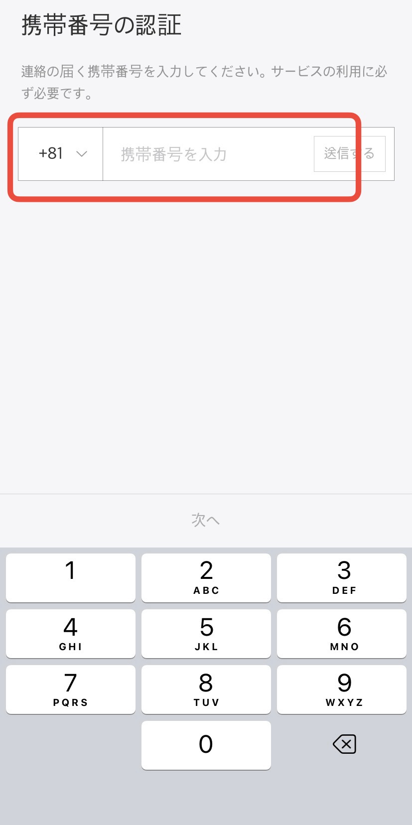 続いて、携帯番号の認証を行います。日本の携帯電話の場合は、日本の国番号「+81」を選択し、電話番号は頭の0を省いて入力しましょう。番号を入力すると、SMS宛てに4桁の認証番号が送られてくるため、アプリに戻ってコードを入力します。