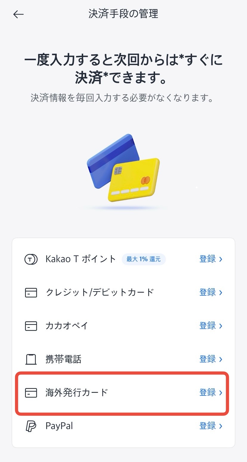 支払い方法を登録します。アプリトップ画面の右下にある「マイ情報」から「決済手段の管理」をタップします。日本のクレジットカードを登録したい場合は「海外発行カード」をタップし、カード情報を入力するとアプリ内決済が利用可能になります。