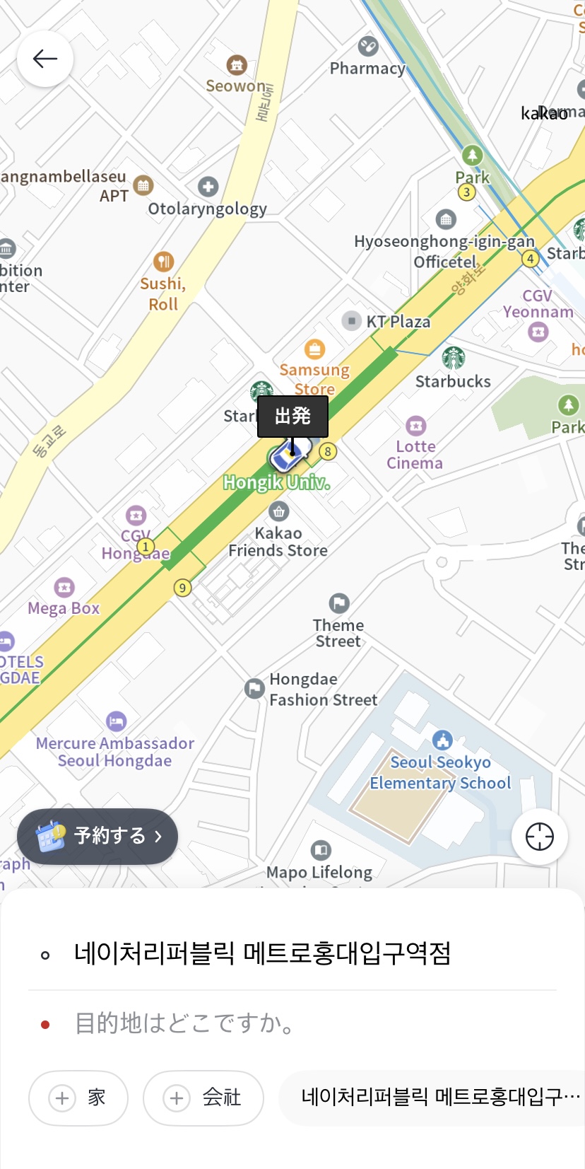 今回はソウルで利用すると仮定し、「弘大(ホンデ)駅」周辺から「景福宮(キョンボックン)」周辺までの乗車を例に説明します。