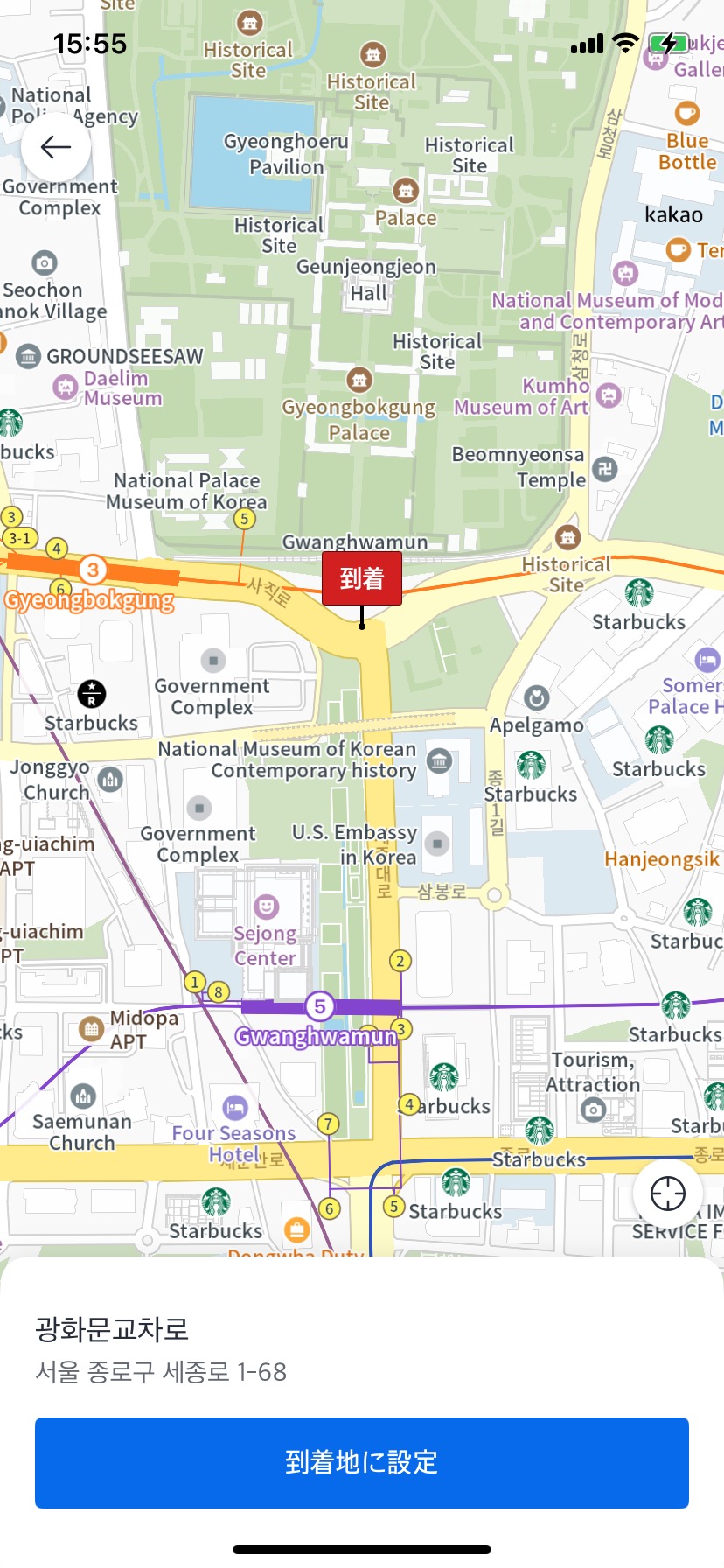 「目的地はどこですか。」をタップし、アルファベットもしくはハングルで「Gyeongbokgung Palace(경복궁)」と入力します。このとき、地図から目的地を選択することも可能です。