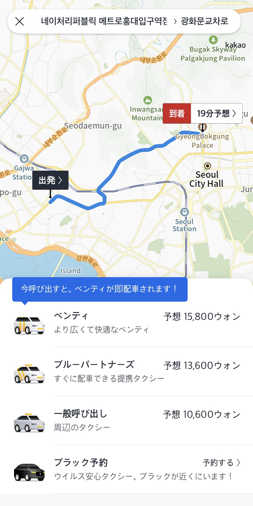 出発地と目的地を入力すると、「車種」「予想料金」「到着時間の目安」「ルート」が表示されます。カカオタクシーでは、金額や車のサイズ、到着時間などにより、以下のような多様な車種が用意されています。金額や用途に合わせて、好みの車種を選択しましょう。