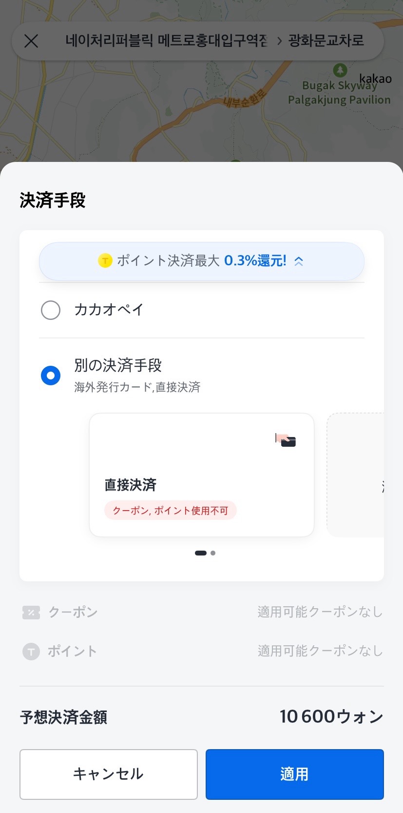 なお、カカオタクシーではクレジットカードでのアプリ内決済以外にも、乗車後に車内でドライバーへ直接現金またはクレジットカードで支払うことも可能。直接支払いを希望の場合は、決済方法の設定は不要です。