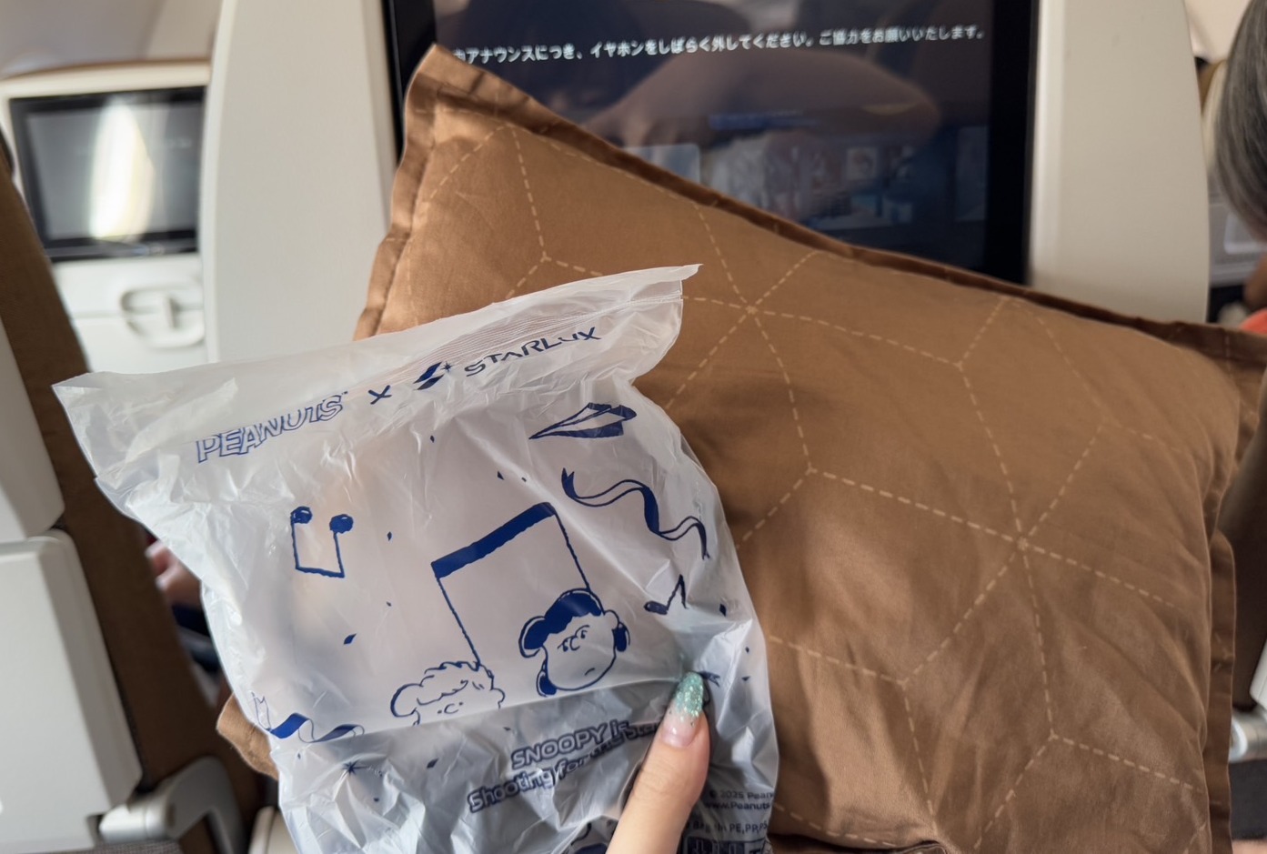 プレミアムエコノミーとエコノミークラスのアメニティの違いはブランケット。プレミアムクラスのブランケットは両面生地でふわふわでした。