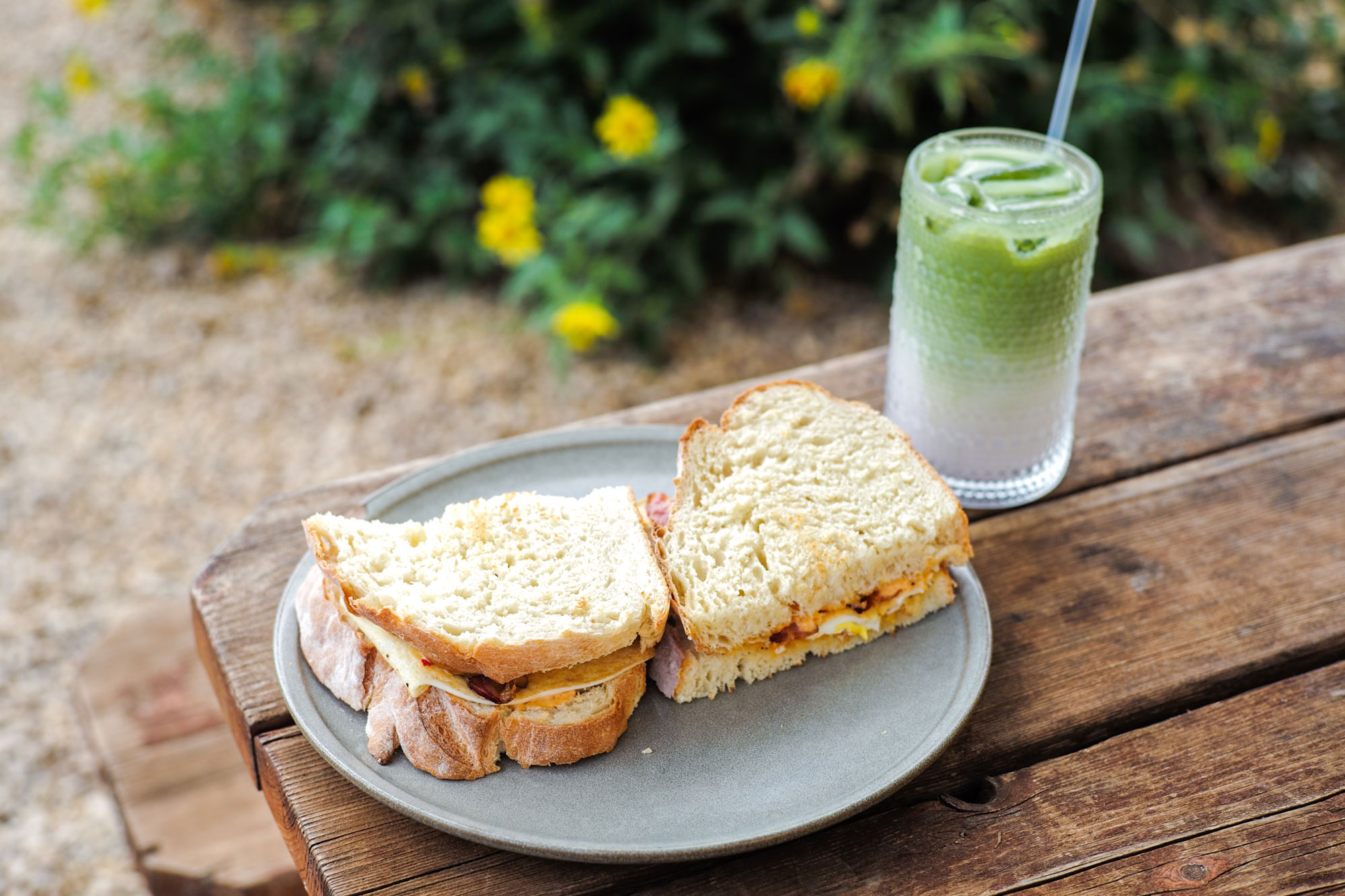 まだ観光客が少なく、ほとんどローカルのお客さんでにぎわう店内では、オーガニックなど素材にこだわり手作りするパンやペイストリー類がずらり。写真は自家製のパンを使用した「ベーコン・エッグ・チェダー」12.50ドル。ふっくらしたパンと塩気のあるチーズとハムのバランスが絶妙なひと品。サンドイッチのお供にしたい「ウベマッチャラテ」7.50ドルのほかこだわりのドリンクメニューも評判です。