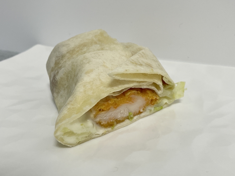 ピリ辛の韓国産チキンにベーコン、レタス、甘めのマヨネーズがトルティーヤに包まれています。ソースが垂れないので食べやすく、おやつにぴったりで美味しいです。価格は単品で3500ウォン(約372円)です。